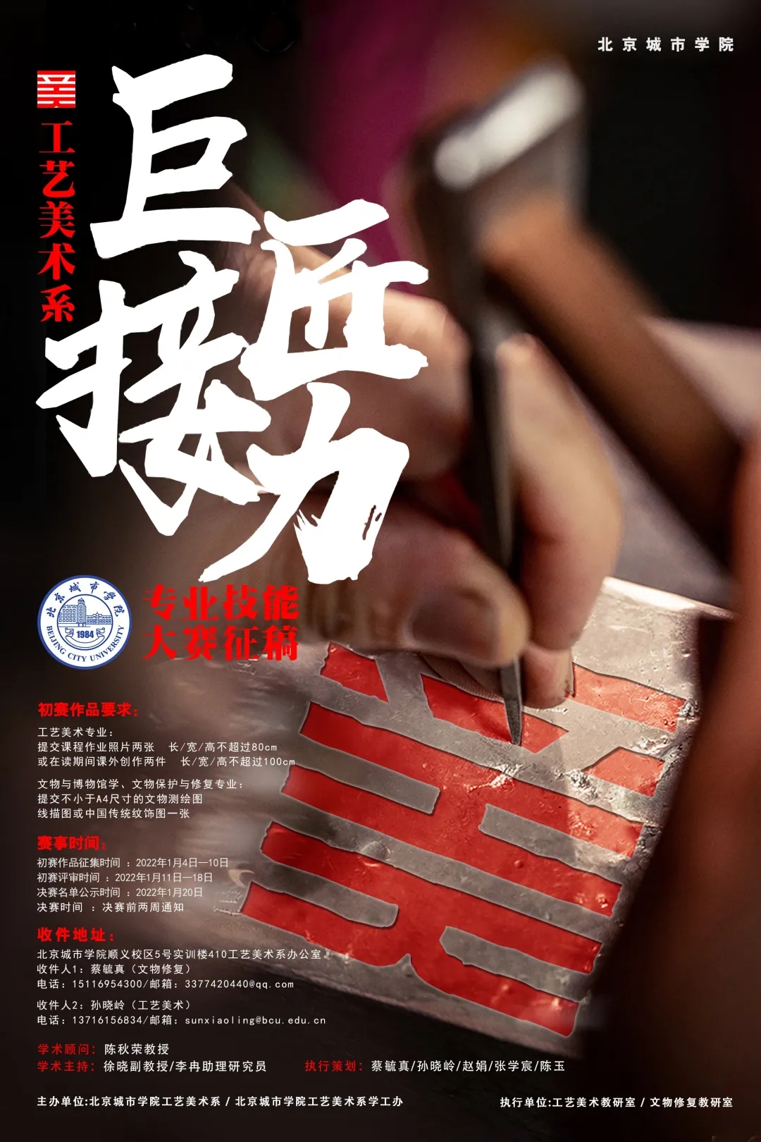 为切实加强和改进学风建设,提高学生创新实践和动手能力,全面提升学生的综合素质和核心竞争力,工艺美术系组织协调各教研室和学工办,举办“巨匠接力”专业技能大赛,践行师生共建良好学风,欢迎全体工艺美术系在校生积极投稿参赛。