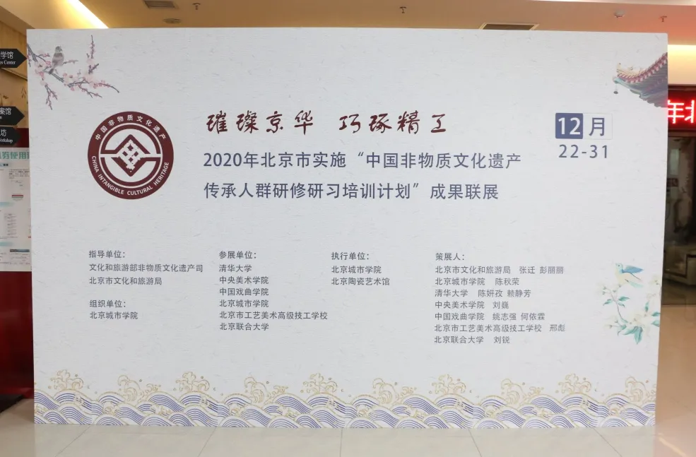 12月22日下午,在文化和旅游部非物质文化遗产司、北京市文化和旅游局的指导和支持下,清华大学、ac米兰官网中文网站、北京市工艺美术高级技工学校等院校联合举办的 2020年北京市实施“中国非物质文化遗产传承人群研修研习培训计划”成果联展在北京陶瓷艺术馆开幕。此次展览展示了研培计划参与院校清华大学、中央美术学院、中国戏曲学院、ac米兰官网中文网站、北京市工艺美术高级技工学校的研培计划成果及北京联合大学的“非遗+旅游”主题培训成果。本次联展创新构建高校研培互助协商共享平台,是深化研培计划成果、扩大研培交流、推动社会力量参与非遗保护的有益创新与实践。
