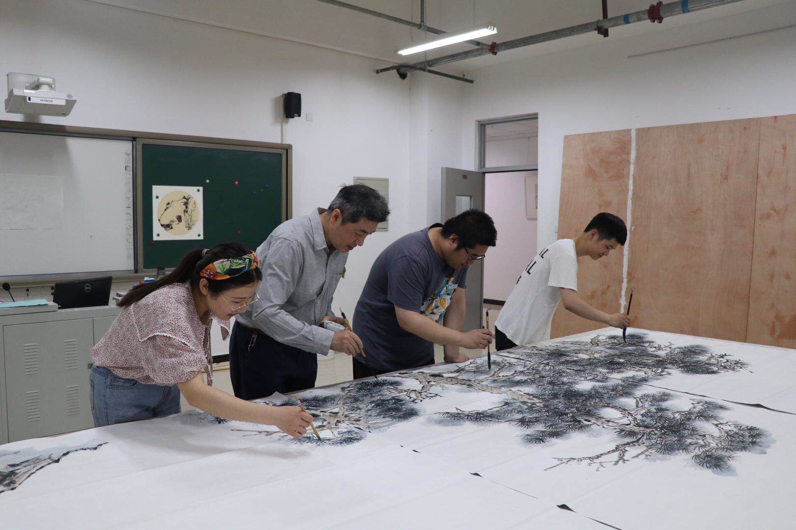 工艺美术系主任陈秋荣教授,及林煜峰教授、李艳梅副教授担任了画作的主创,中国画方向研究生李米青、颜路瑶、乔妞妞、韩玉、曹秀玉,篆刻方向研究生孟令超和文物修复专业方向学生颜祯鑫、孟祥明、管静、张梦桐、鲍羽虹、刁羽、刘星妤、戴泽琳、周璐等作为主创团队成员,全程参与到了绘画的创作与装裱工作中,历时不到一个月完成了该幅画作的制作。画作制作过程也是师生们将专业知识应用到实践创作的过程。