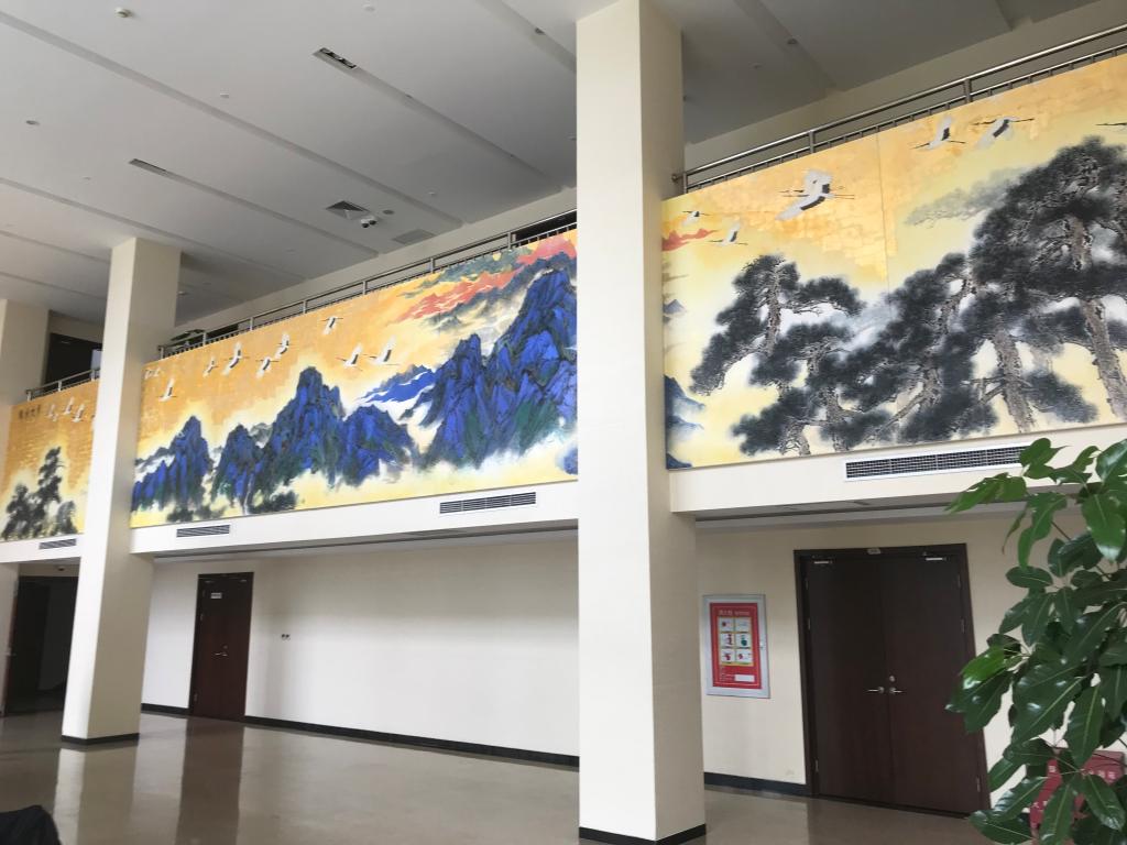 画作长15.91米、高2.4米;以“鹤鸣九霄”为主题,画面主要由仙鹤、山川、长城、松林等元素构成,运用传统绘画中青山绿水的艺术语言,巧妙采用髹金箔、洒螺屑等技艺进行装饰,表达了学校的发展愿景、办学理念和人才培养目标。