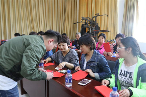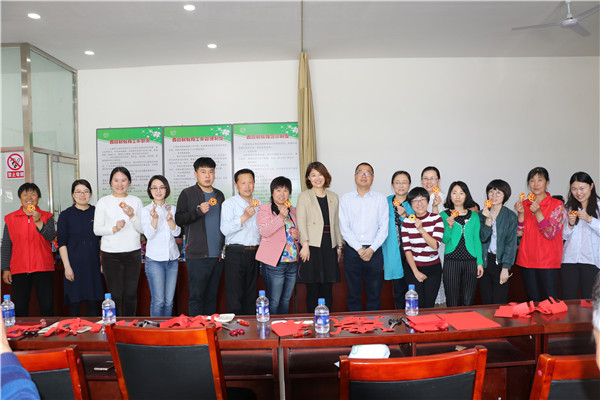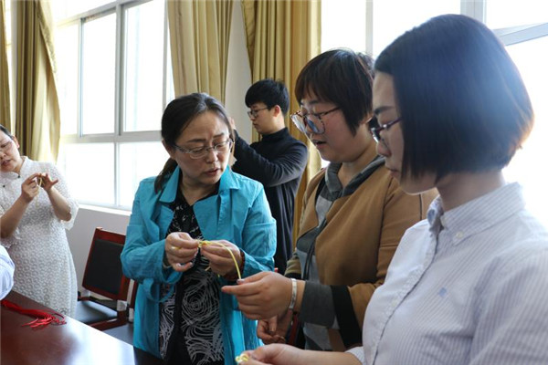 随后,工艺美术系教师李俊成、袁若南、倪巧凤、汪云峰分别为大家讲解了剪纸和编绳的基本方法,并带领与会人员亲手制作剪纸和编绳作品。