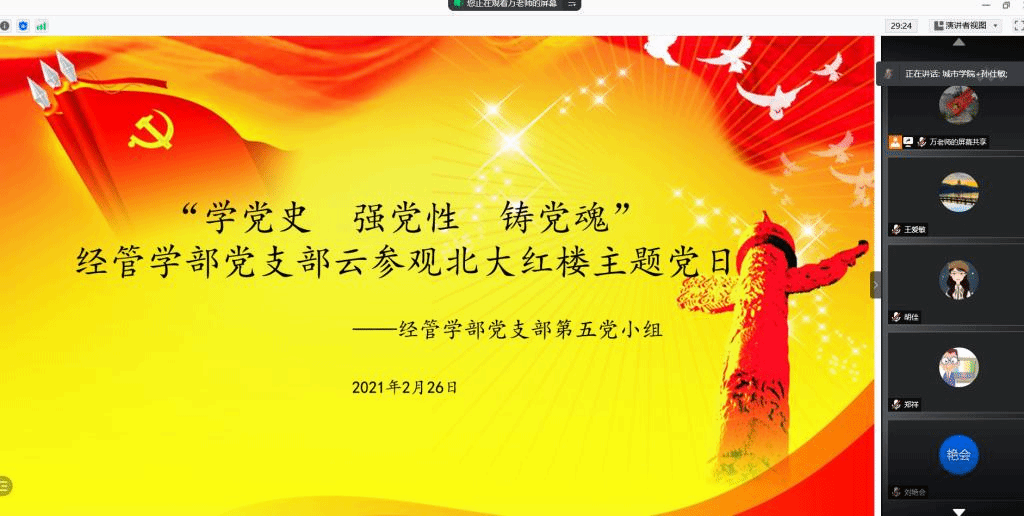 2月22日至26日,经济管理学部党支部组织全体党员、预备党员和积极分子,开展了“学党史 强党性 铸党魂——云参观北大红楼”主题党日活动。校党委常委、统战部长蔡派参加活动。
