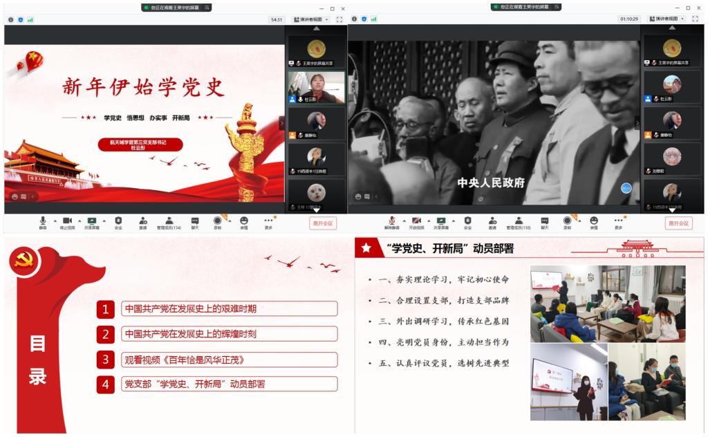 2月27日,航天城校区学管第三党支部开展了主题为“学党史明思想,悟初心践使命”主题党日活动,集体学习了总书记的重要讲话精神。航天城校区学管第四党支部通过腾讯会议开展了“知党史,感党恩,跟党走”主题党日活动,传达习近平总书记重要讲话精神,观看党史教育视频。