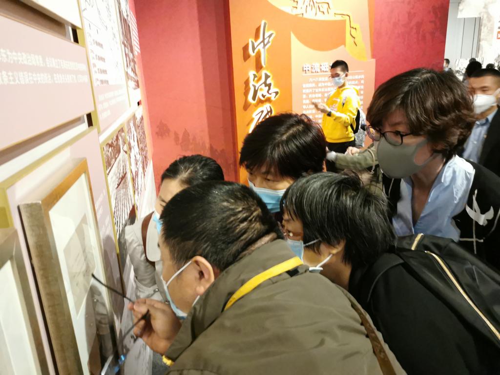 支部成员沿着中国共产党的诞生、土地革命、抗日战争、新中国成立四个时期的时间脉络,依序参观了“东方破晓”“星火燎原”“中流砥柱”“夺取胜利”四个主题单元。《青年杂志》一卷一号、《共产党宣言》全译本、嘉兴南湖纪念红船、开国大典礼炮,大家通过280组件图片、照片和实物展品重温中国共产党不断探索马克思主义中国化的历史进程,体会中国共产党的“百年征程波澜壮阔,百年初心历久弥坚”。