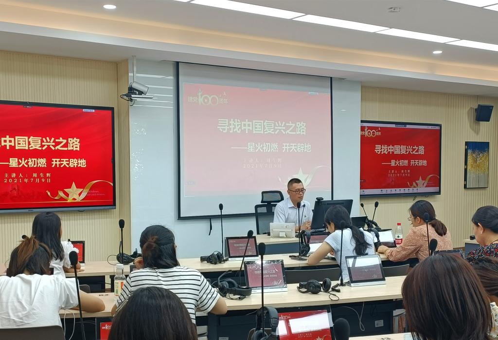 7月9日下午,国际文化与传播学部党支部书记周生辉,以《寻找中国复兴之路——星火初燃 开天辟地》为题为全体党员讲党课。