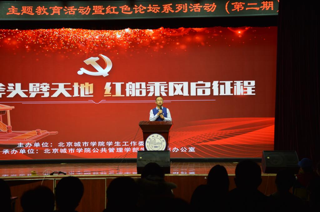 12月20日,由学工委主办、公共管理学部学工办承办的“镰刀斧头劈天地· 红船乘风启征程 ——‘永远跟党走’主题教育活动暨红色论坛(第二期)在航天城校区食堂四层多功能厅举办。航天城校区主任、航天城校区学管党总支书记赵志强,学工委副书记陈怡,航天城校区学生处处长曹继伟,马克思主义学院吴昌盛及航天城校区各学管党支部书记应邀出席。