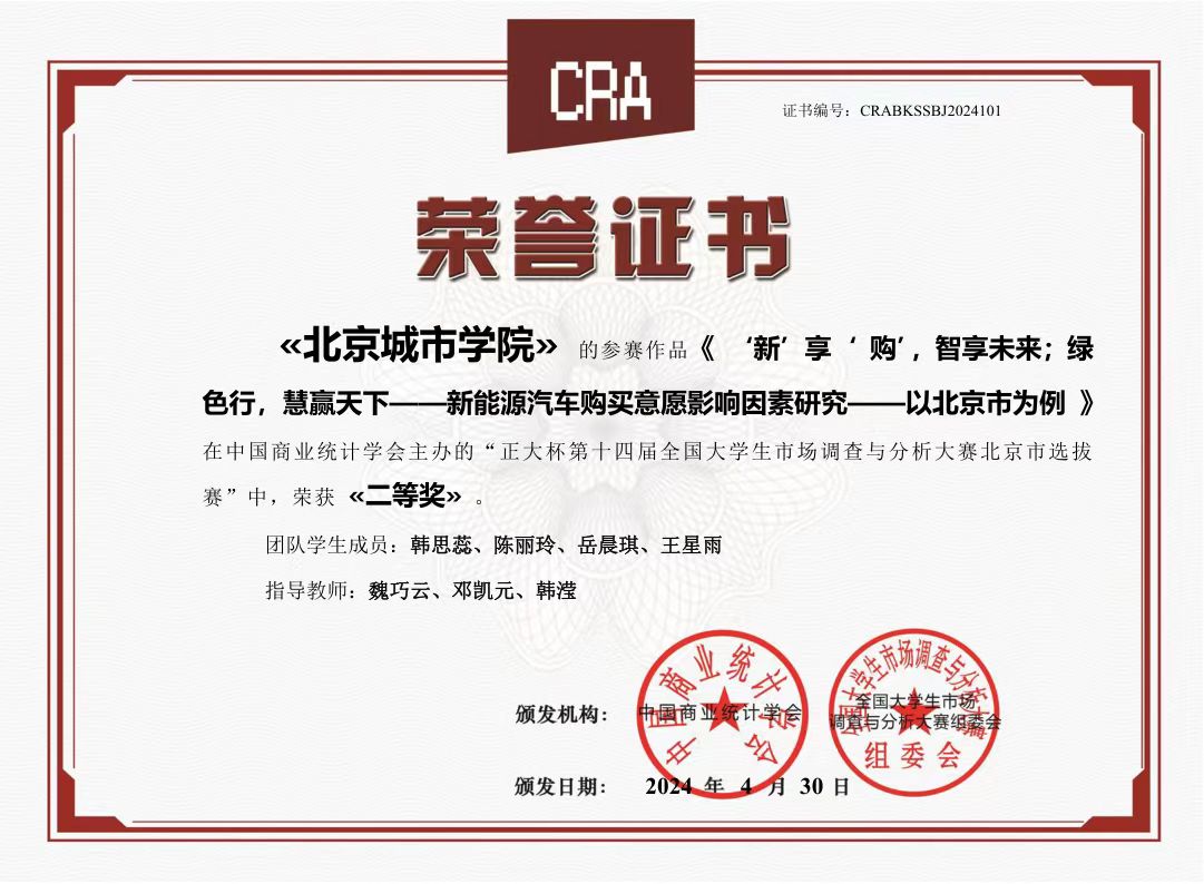 作品《‘新’享‘购’,智享未来;绿色行,慧赢天下——新能源汽车购买意愿影响因素研究——以北京市为例》围绕新能源汽车市场、行业状况、消费者使用情况等多个角度,深入探讨新能源汽车影响因素之间的联系,并挖掘客户特性中的潜在价值,从而为新能源汽车销售商提供实用且有效的建议。