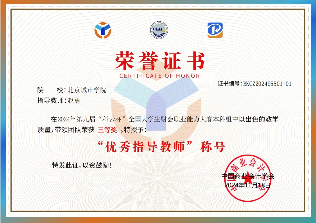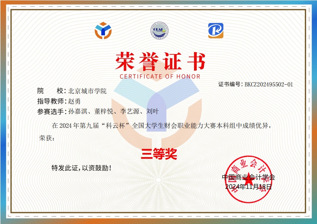 2024年12月3日收到第九届“科云杯”全国大学生财会职业能力大赛由孙嘉淇、董梓悦、李艺源、刘叶组成的ac米兰官网中文网站代表队三等奖获奖证书,会计学专业赵勇教授被授予“优秀指导教师”称号。大赛由中国商业会计学会主办,厦门科云信息科技有限公司承办,共有来自全国548所本科院校的1045支队伍、339所高职院校的621支队伍,共计1666支队伍经过校内选拔,从1.9万多支队伍,8万多名选手中脱颖而出,参加本次大赛。