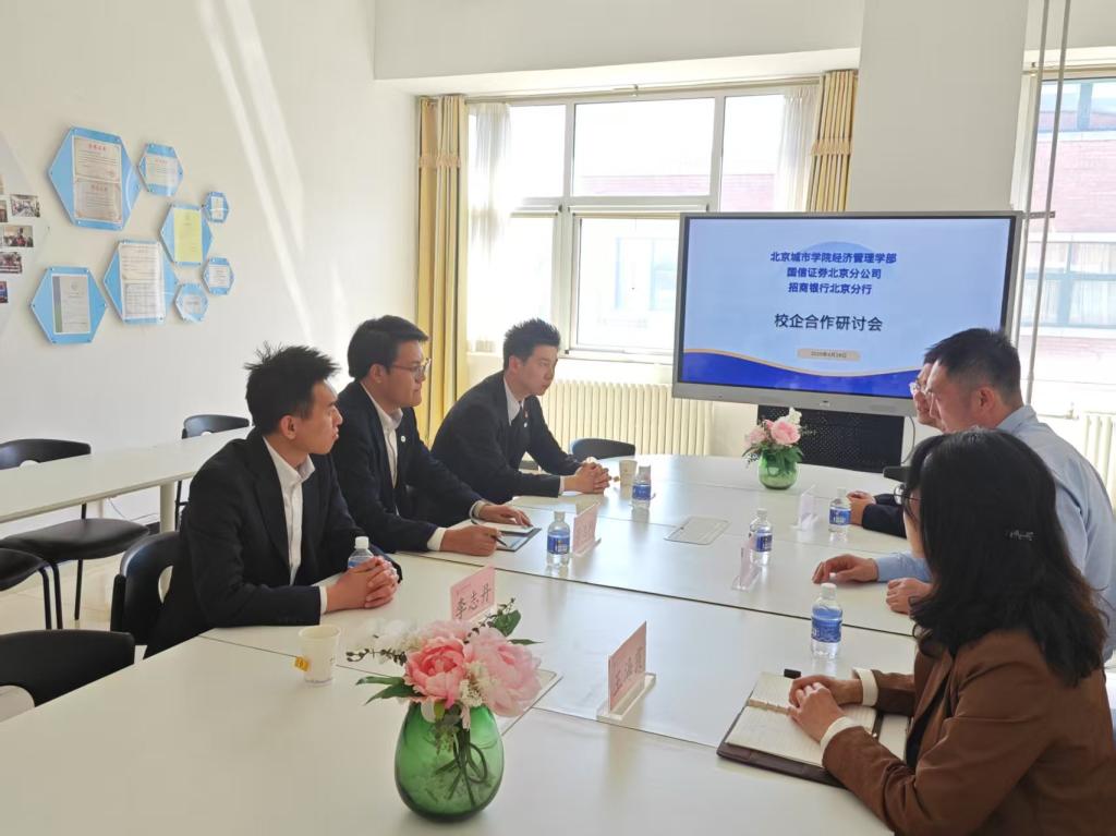4月28日,招商银行北京分行及国信证券北京分公司代表一行到访学部,就应届毕业生招聘、校企协同育人等事宜开展深入交流。招商银行北京分行田村支行行长崔复阳、国信证券北京分公司二级部总李志丹及营业部总经理景浩轩,经管学部主任杨培玉、副主任王海霞、邓凯元参与座谈。