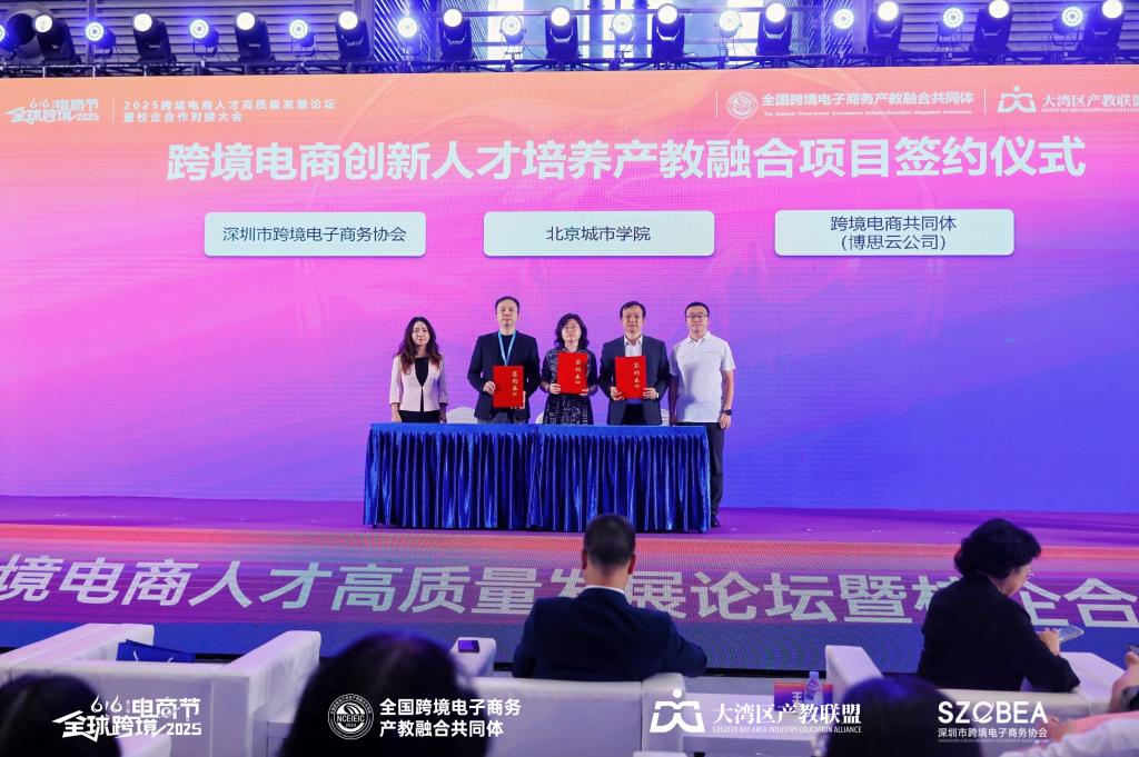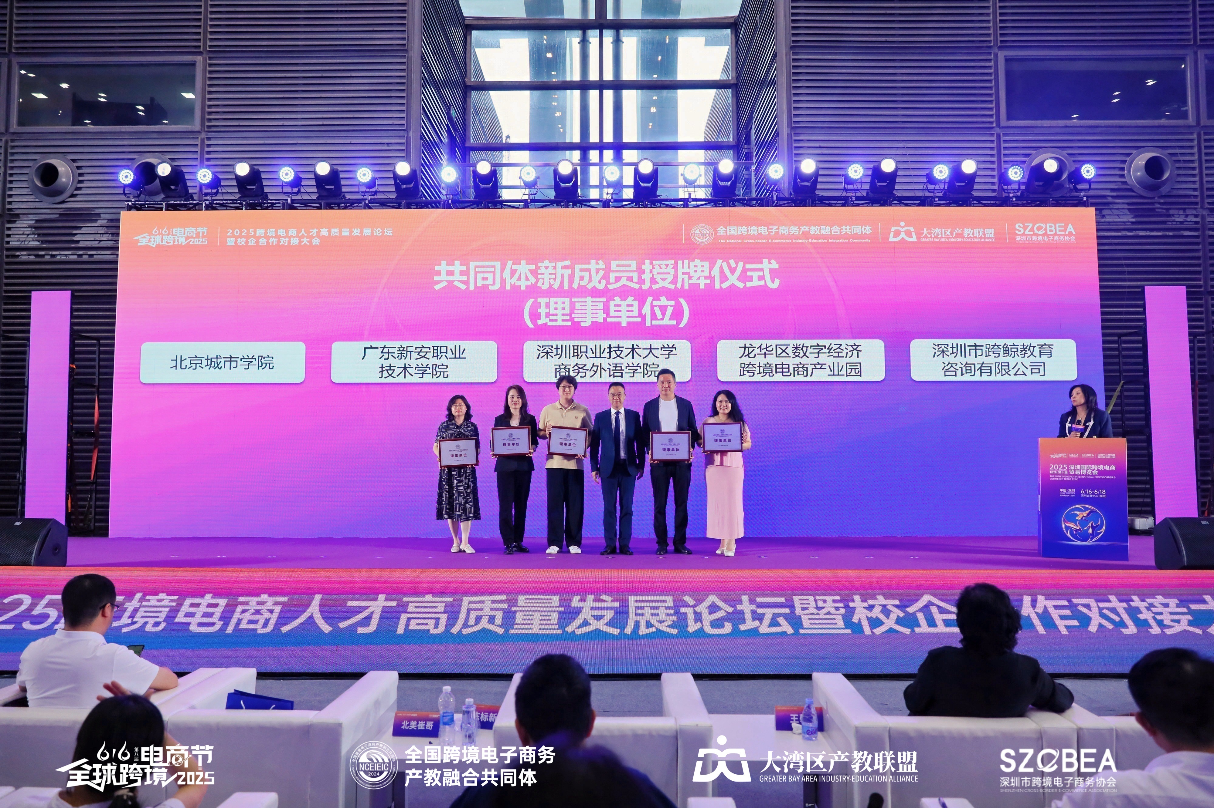 2025年6月17日,2025跨境电商人才高质量发展论坛在深圳福田会展中心举行。此次活动由全国跨境电子商务产教融合共同体、大湾区产教联盟、深圳市跨境电子商务协会、广东省数字经济产业创新人才联盟(筹)联合主办。活动现场举行了共同体理事单位授牌仪式。ac米兰官网中文网站被授予“全国跨境电子商务产教融合共同体”理事单位,经济管理学部国际商务教研室主任祁春凌教授代表学校接受了授牌。