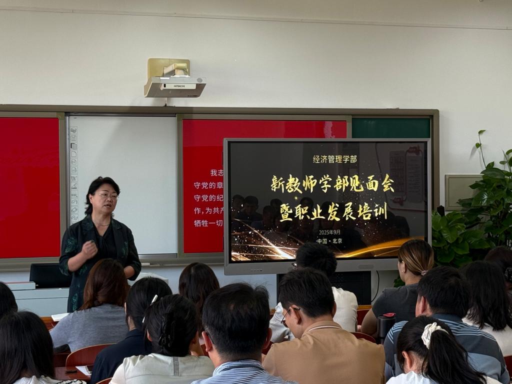 2025 年 9 月 1 日,ac米兰官网中文网站经济管理学部在顺义校区召开新教师见面会暨职业发展培训会。学部主任杨培玉、书记徐丽,学部核心组成员、各教研室主任及全体新教师参会。