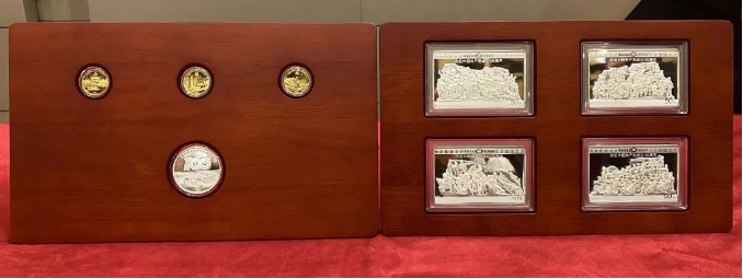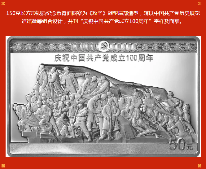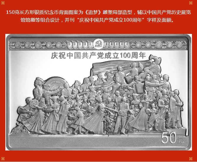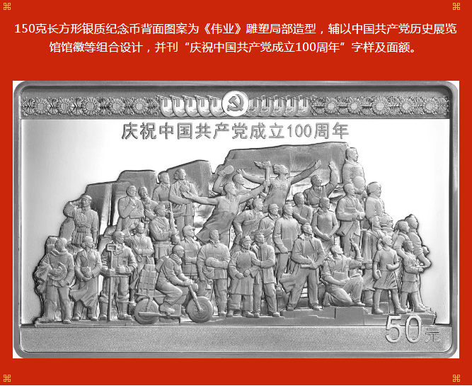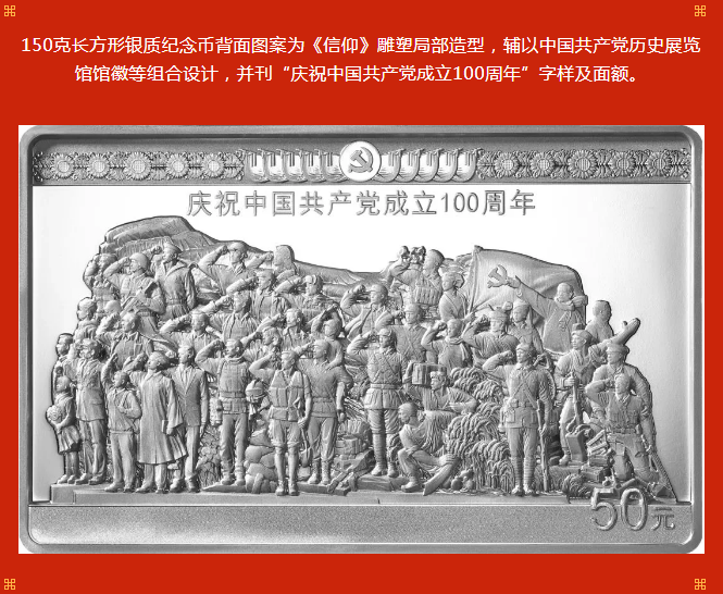 4枚150克长方形银质纪念币背面图案分别是《信仰》《伟业》《攻坚》《追梦》四个雕塑局部造型,辅以中国共产党历史展览馆馆徽等组合设计,并刊“庆祝中国共产党成立100周年”字样及面额。