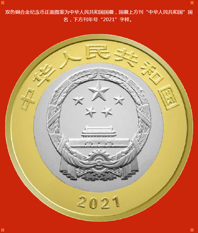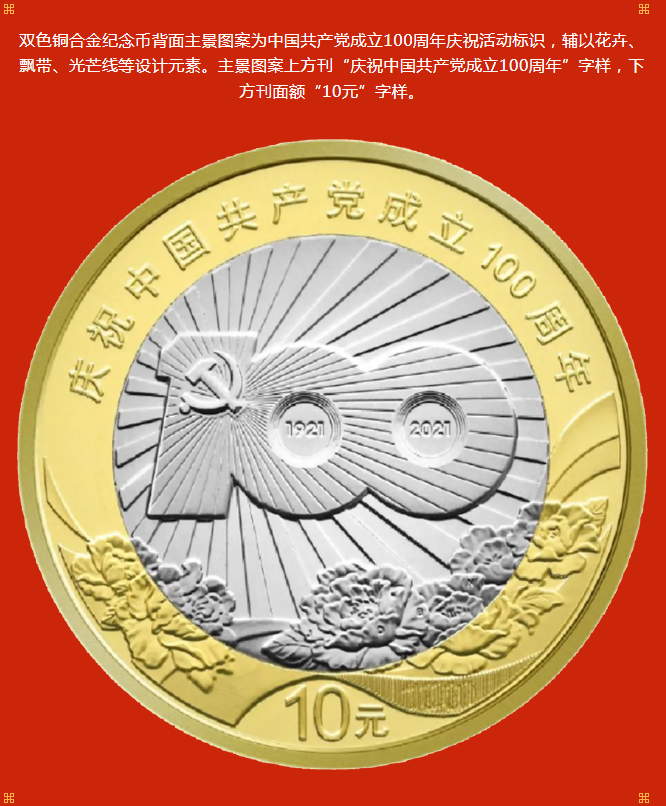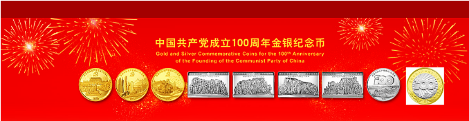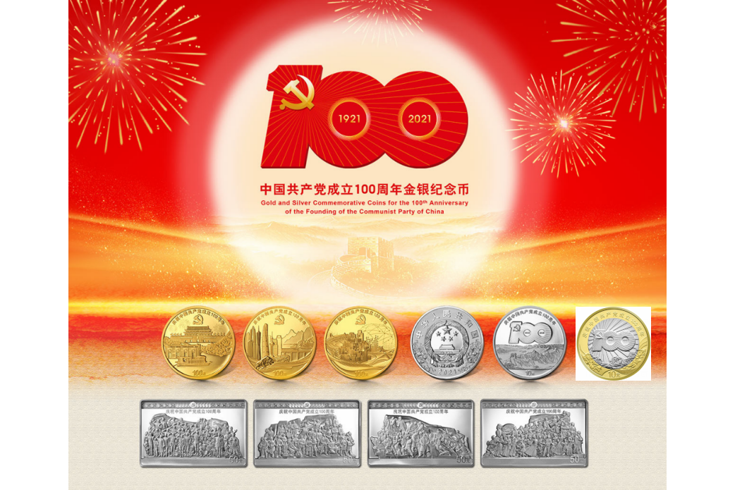 2021年6月21日,中国人民银行陆续发行中国共产党成立100周年纪念币一套。该套纪念币共9枚,其中金质纪念币3枚,银质纪念币5枚,双色铜合金纪念币1枚,均为中华人民共和国法定货币。