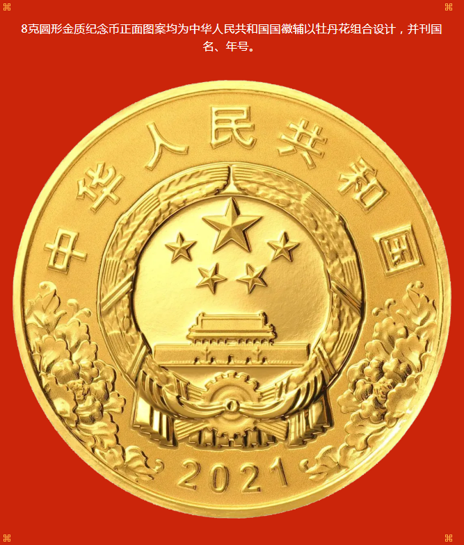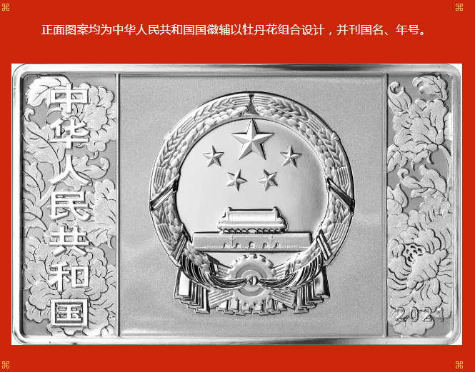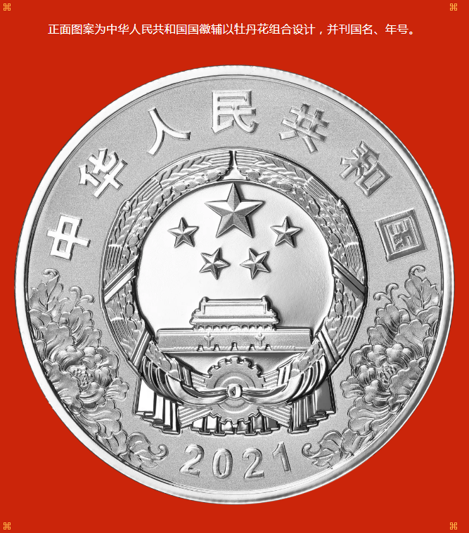此次发行的金质纪念币和银质纪念币正面图案均为中华人民共和国国徽辅以牡丹花组合设计,并刊国名、年号,币面设计庄重、严肃。