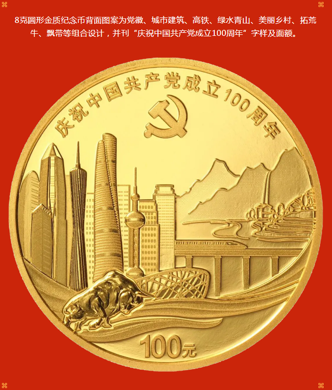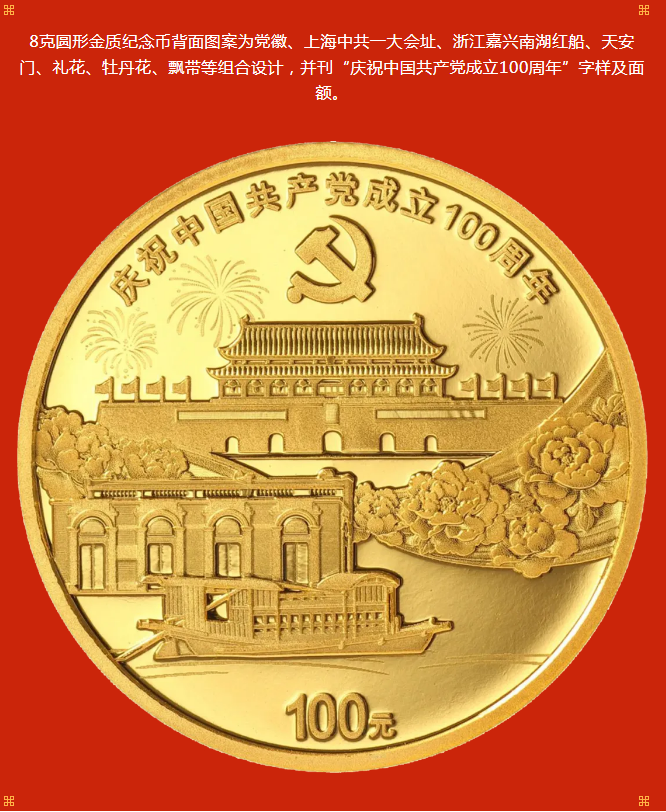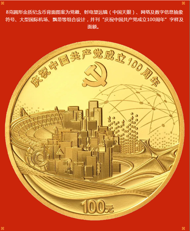 3枚8克圆形金质纪念币背面图案,除了党徽和飘带等共有元素外,有的是上海中共一大会址、浙江嘉兴南湖红船、天安门等组合,有的是城市建筑、高铁、绿水青山、美丽乡村、拓荒牛等组合,有的是中国天眼、网络及数字信息抽象符号、大型国际机场等组合。