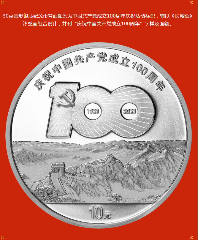 30克圆形银质纪念币背面图案为中国共产党成立100周年庆祝活动标识,辅以《长城颂》漆壁画组合设计等。此套纪念币紧密围绕中国共产党成立100周年庆祝活动这一主题,既有深沉厚重的历史积淀,又有喜庆热烈的节日氛围。