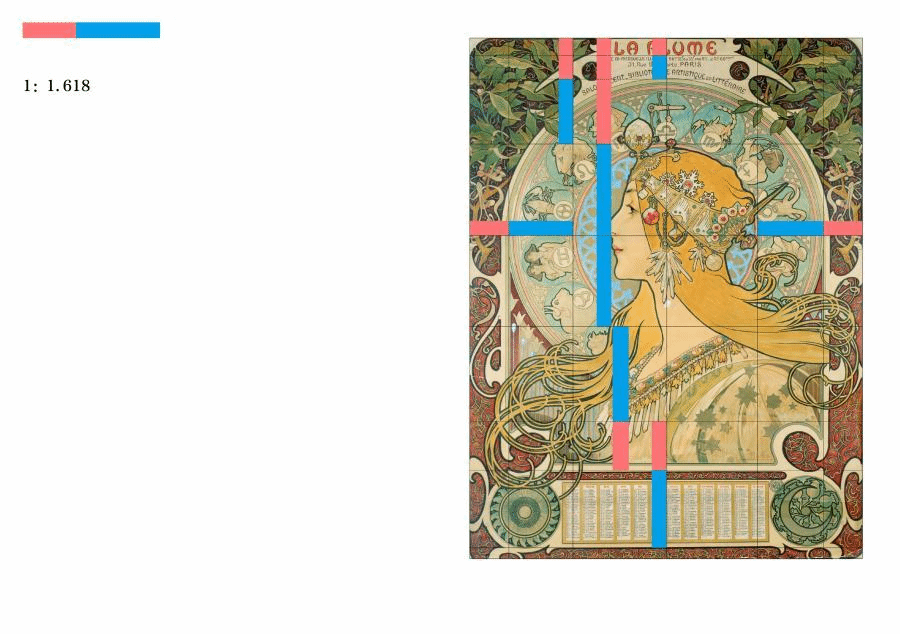 令人印象深刻的是,在介绍《穆夏·新艺术运动先锋》这本书时,其中的“网格体系”设计方式获得了大家关注。这是一本穆夏的作品图集,田老师从穆夏的代表作品中总结了一个规律:他发现每张画的比例都是1:1.618的黄金比例,于是,在其中提炼出6:9的不规则网格系统,从封面到内文排版都依照了这种倒推式的网格体系而设计。这对大家之后的设计和创作给予了启发。