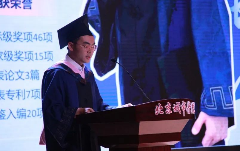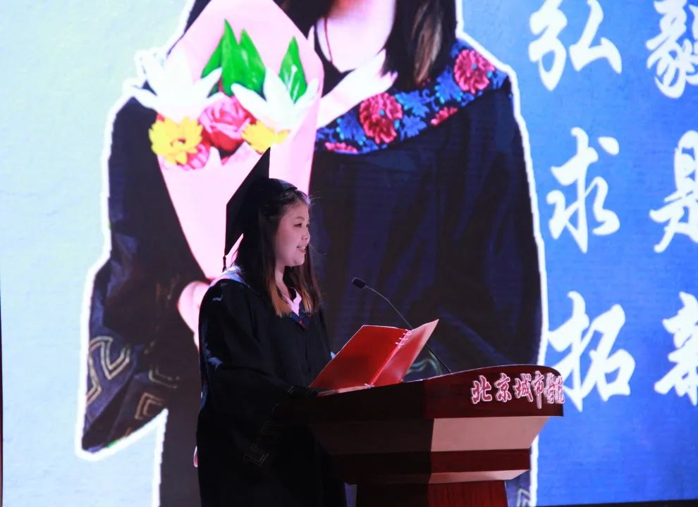 优秀研究生和本科生代表发言。 他们用真挚动人的语言,深情回顾了在北城求学的点滴时光。他们的发言饱含着对母校培养的感激之情,对老师们谆谆教诲的感恩之心,他们表示将牢记校训精神,将其践行于未来的工作之中。