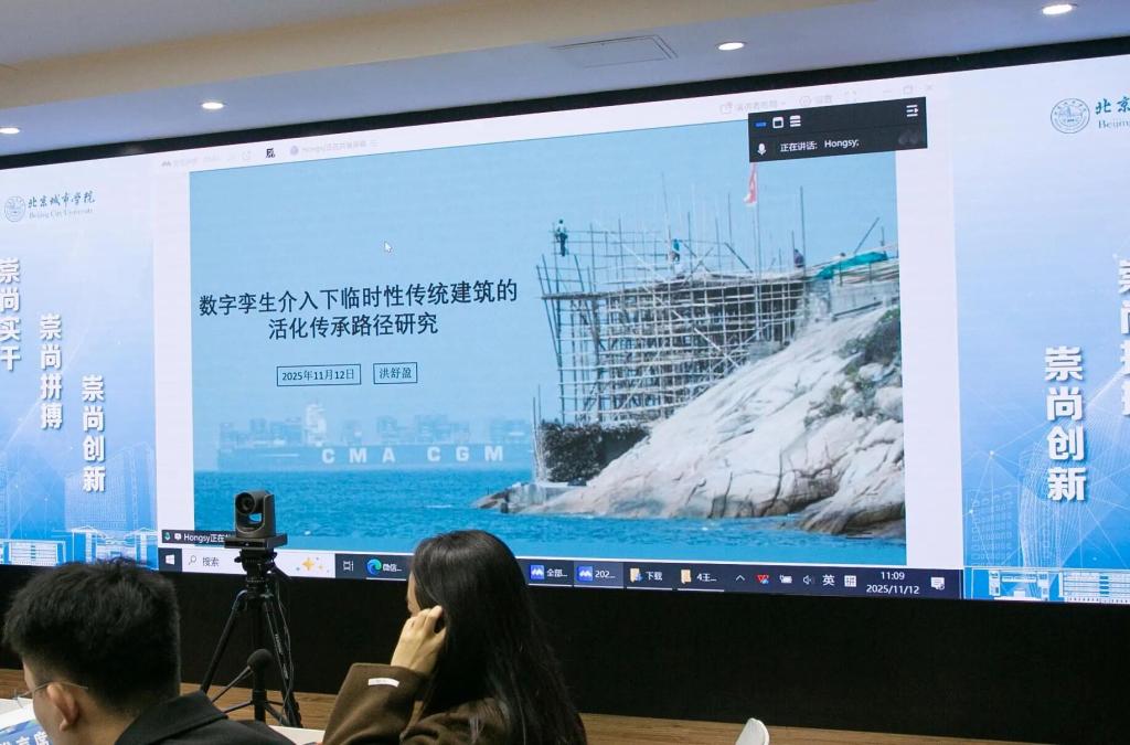 洪舒盈博士在韩国连线现场,以《数字孪生介入下临时性传统建筑的活化传承路径研究》为题,聚焦粤港澳地区濒危的“竹棚”建筑,提出通过三维扫描、数字重构与公众参与平台,推动其在教育、文创等领域的活化共享,为非遗传承提供创新解决方案。