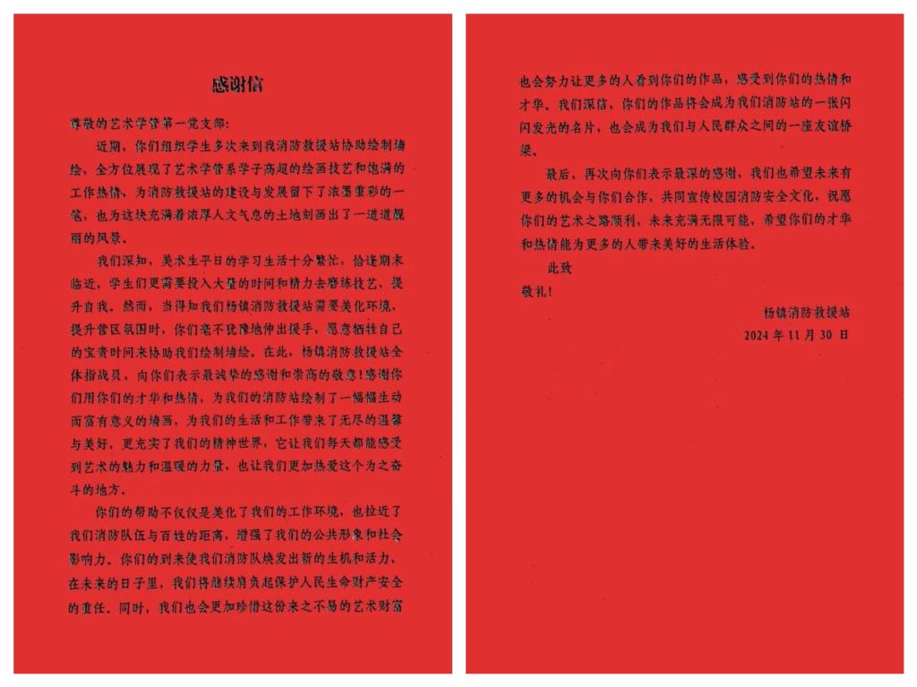 近日,杨镇消防救援站向ac米兰艺术学部学管第一党支部发来感谢信,感谢支部携手杨镇消防救援站,成功举办了一场意义非凡的墙绘志愿服务活动。在这场历时一个月的活动中,30余名富有才华与热情的艺术设计学部学生利用课余时间走进杨镇消防救援站,用画笔为消防战士们的生活空间增添了亮丽的色彩,展现出了专业的绘画水平和无私奉献精神。
