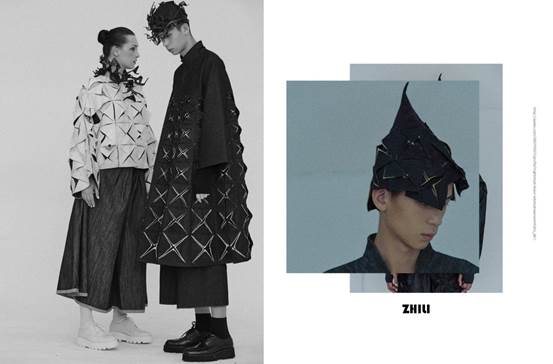 本设计运用模糊性别的款式与廓形,工艺采用折纸工艺所有的浅色均为漂水点色和漂色效果。