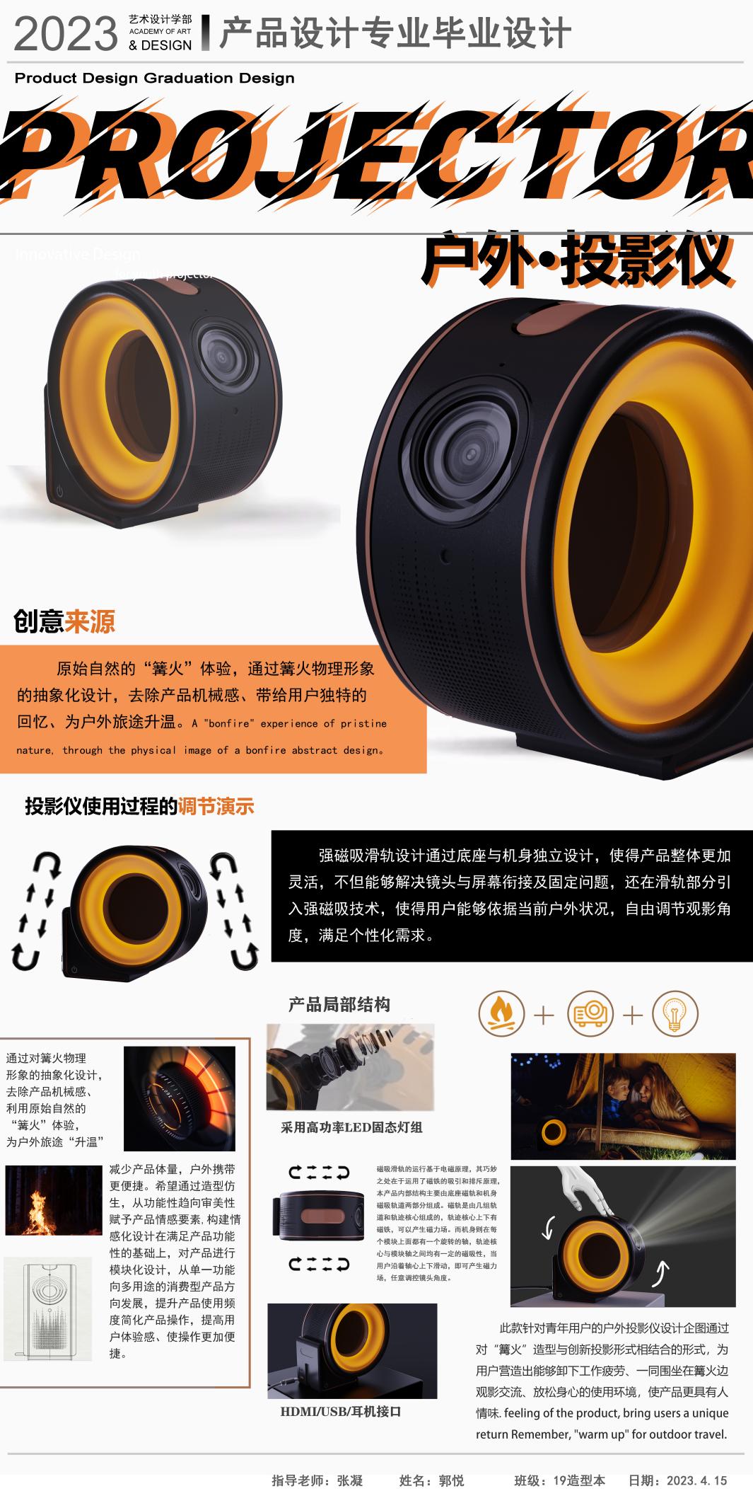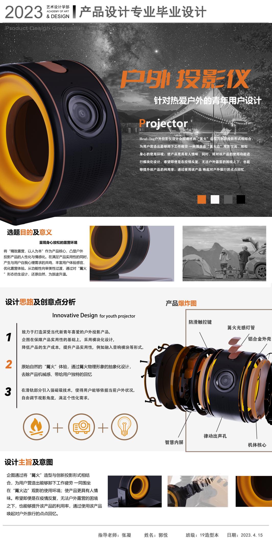 在童年时期的孩子总是想象力非常丰富的,时常会幻想在黑夜中的某个角落,躲藏着一些不为人知的幽灵或者怪兽。但是长大以后的成Heal-Ing户外投影仪设计企图通过将“篝火”造型与创新投影仪形式相结合,为用户营造出能够卸下工作疲劳一同围坐在“篝火边”观影交流、放松身心的使用环境;使产品更具有人情味。同时,将对该产品的使用功能进行模块化设计,希望即便是在疫情反复,无法户外露营的困境之下,也能够提升该产品的利用率,通过使用该产品唤起对户外旅行的点点回忙。