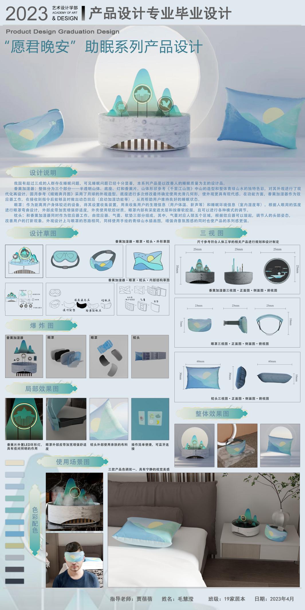 我国有超过三成的人群存在睡眠问题,可见睡眠问题已经十分显著,本系列产品是以改善人的睡眠质量为主的设计品。香薰加湿器:整体分为三个部分——半透明山体、底座、灯和香薰片。山体形状参考《千里江山图》中山的造型和整体青绿山水的独特色彩,对其外观进行了现代化再设计。圆月参考 《嫦娥奔月图》采用了月球的外观造型。底座进行多次修改最终确定使用光滑几何形,使外观更具有现代感。在功能方面,香薰加湿器作为效应器工作,在接收到指令后能够及时做出动态回应(启动加湿功能等),从而帮助用户维持良好的睡眠状态。眼罩:作为距离用户身体较近的设备,将其设置收集装置,用来收集用户的生理信息(用户体温、鼾声等)和睡眠环境信息(室内湿度等)。根据人眼周的弧度进行眼罩弯曲设计,外部皮带加宽增强舒适度,外壳使用软胶材质。眼罩内部有深度遮光层和按摩软胶层,且可以进行各种模式的调节。枕头和香薰加湿器同时作为效应器工作。由效应器、气囊、软垫三部分组成。其中,气囊对应人颈五个区域,根据效应器可以鼓起,调节人的头部姿态,改善用户的打鼾现象。外观设计上与眼罩的思路相同,同样使用手绘的青绿山水插画图,增强诗意氛围感的同时也使产品的系列感更强。