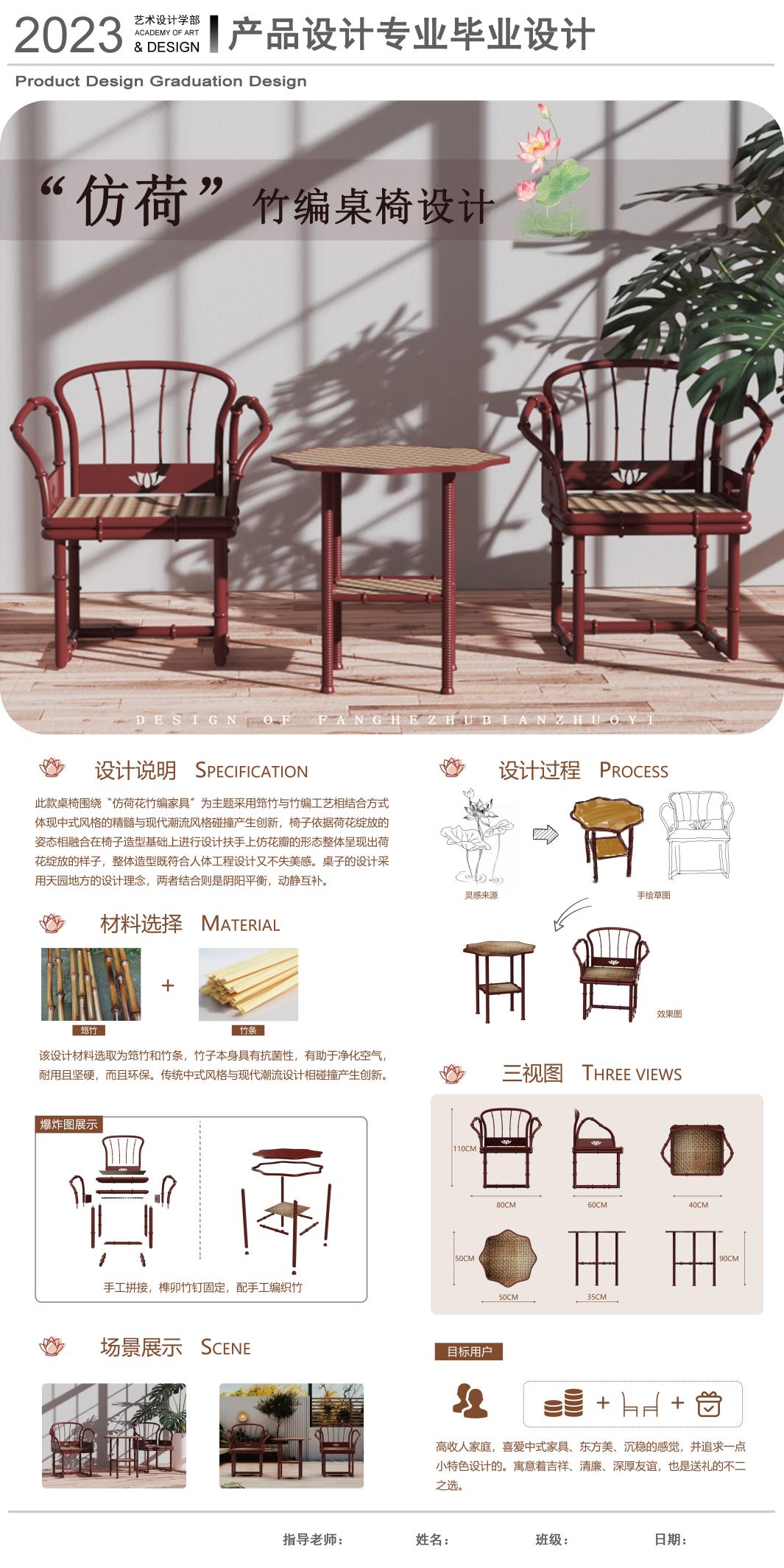 此款桌椅围绕〝仿荷花竹编家具〞为主题采用筇竹与竹编工艺相结合方式体现中式风格的精髓与现代潮流风格碰撞产生创新,椅子依据荷花绽放的姿态相融合在椅子造型基础上进行设计扶手上仿花辦的形态整体呈现出荷花绽放的样子,整体造型既符合人体工程设计又不失美感。桌子的设计采用天圆地方的设计理念,两者结合则是阴阳平衡,动静互补。。