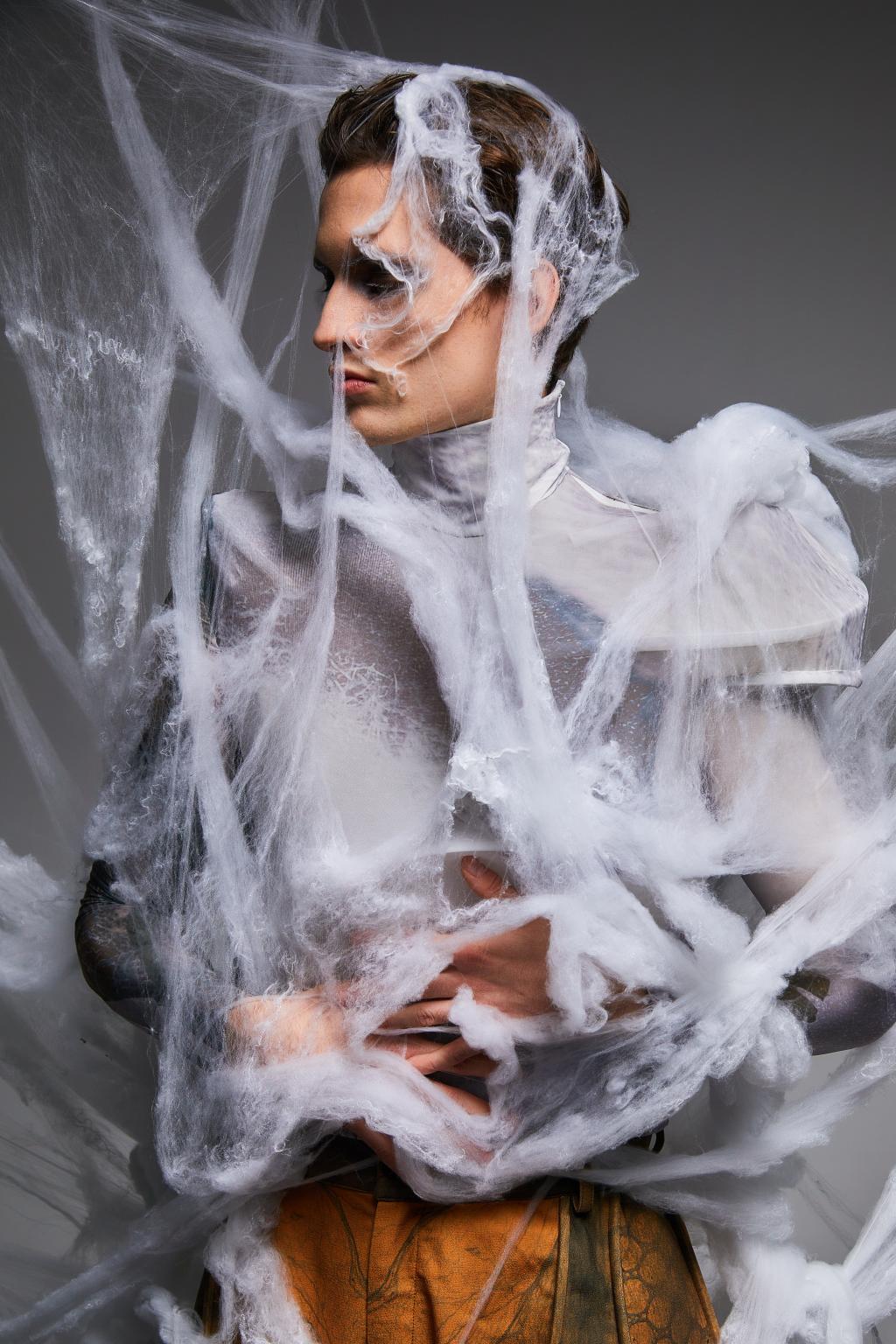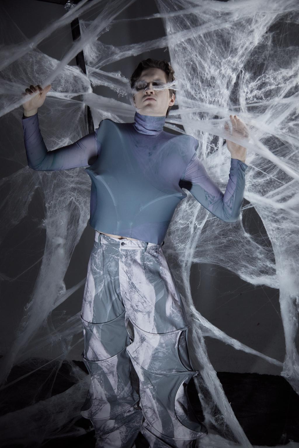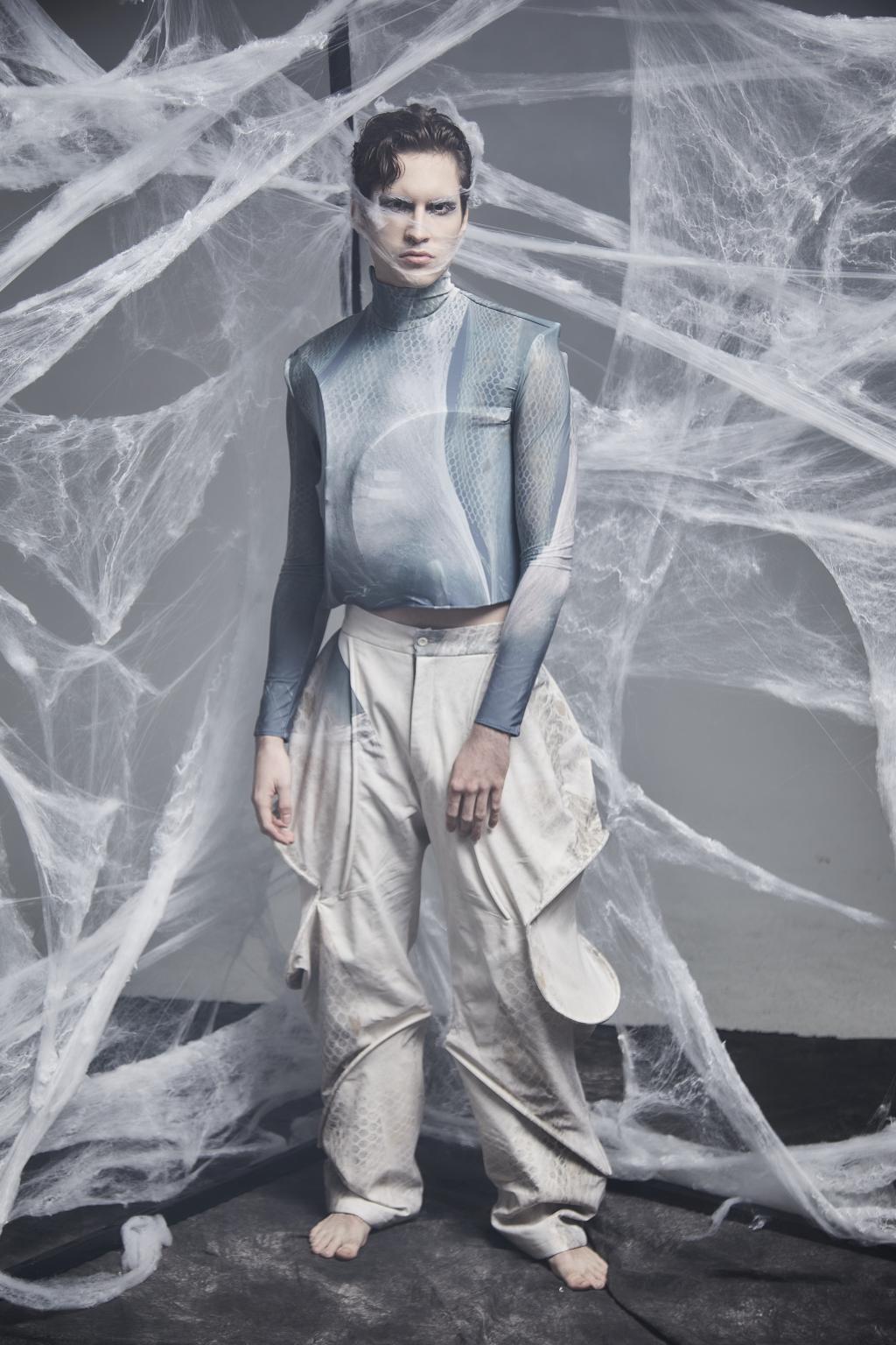 蚕和石蚕,这两种昆虫具有不同筑巢方式,通过这两种不同的生物给我带来了关于服装轮廓和印花的灵感。在服装设计中,我通过这两点灵感对服装进行设计,大胆将生物建筑与服装设计结合。