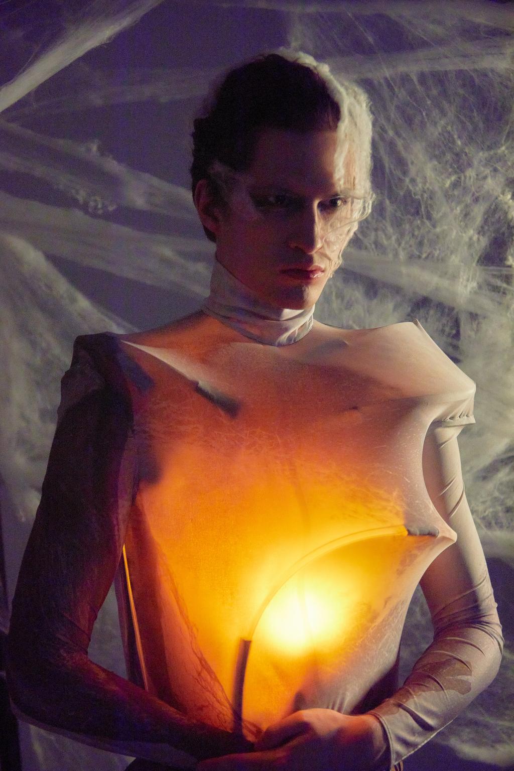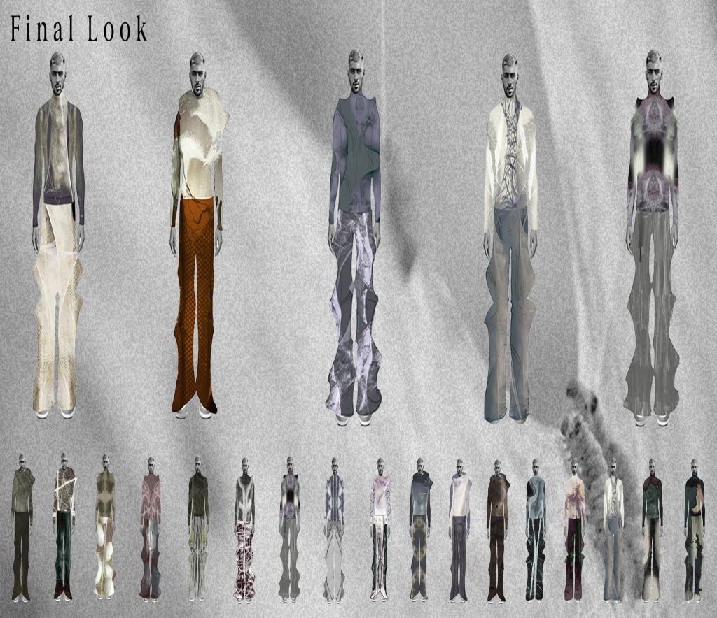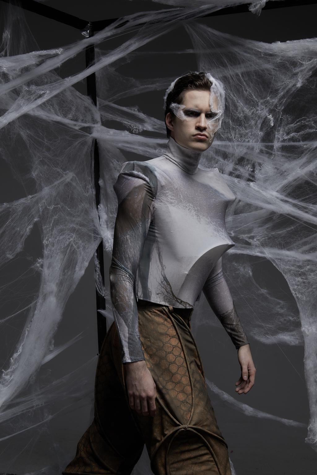 蚕和石蚕,这两种昆虫具有不同筑巢方式,通过这两种不同的生物给我带来了关于服装轮廓和印花的灵感。在服装设计中,我通过这两点灵感对服装进行设计,大胆将生物建筑与服装设计结合。