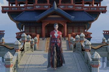 设计理念:主要灵感来源于经典京剧剧目《穆桂英挂帅》。“斜披蟒”穿戴作为角色的特殊点,将盔甲与水袖结合,体现了穆桂英的忠勇、果敢,通过对戏剧服装的色彩和材质巧妙应用,设计出中国风时装,表达东方美学。