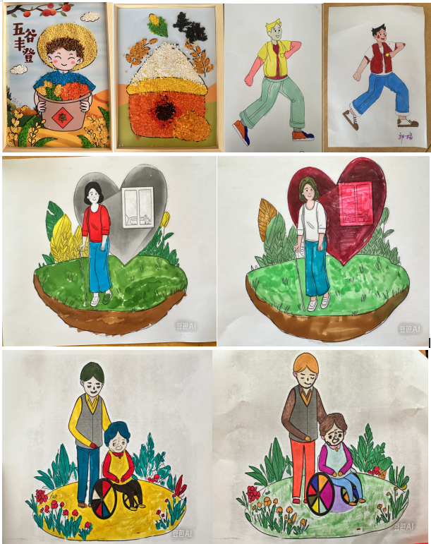 活动以绘画为桥梁,通过艺术的力量为残障人士搭建展示自我、表达情感的平台,呼吁社会关注残障群体,促进他们更好地融入社会。学生志愿者为残障人士讲解绘画技巧,引导他们描绘心中的美好世界。残障人士积极参与,不仅绘制出色彩斑斓的艺术作品,还制作了谷物手工画。