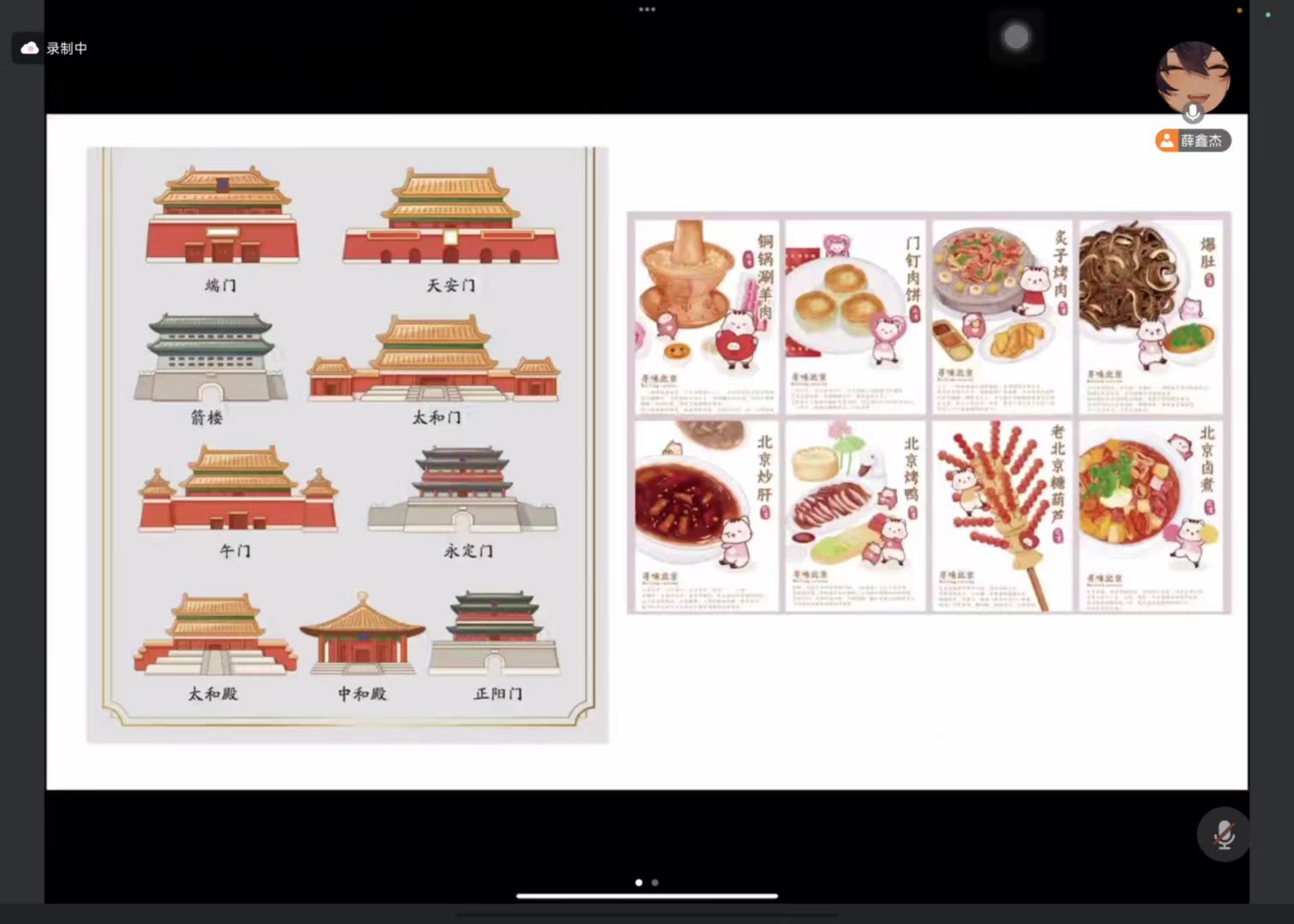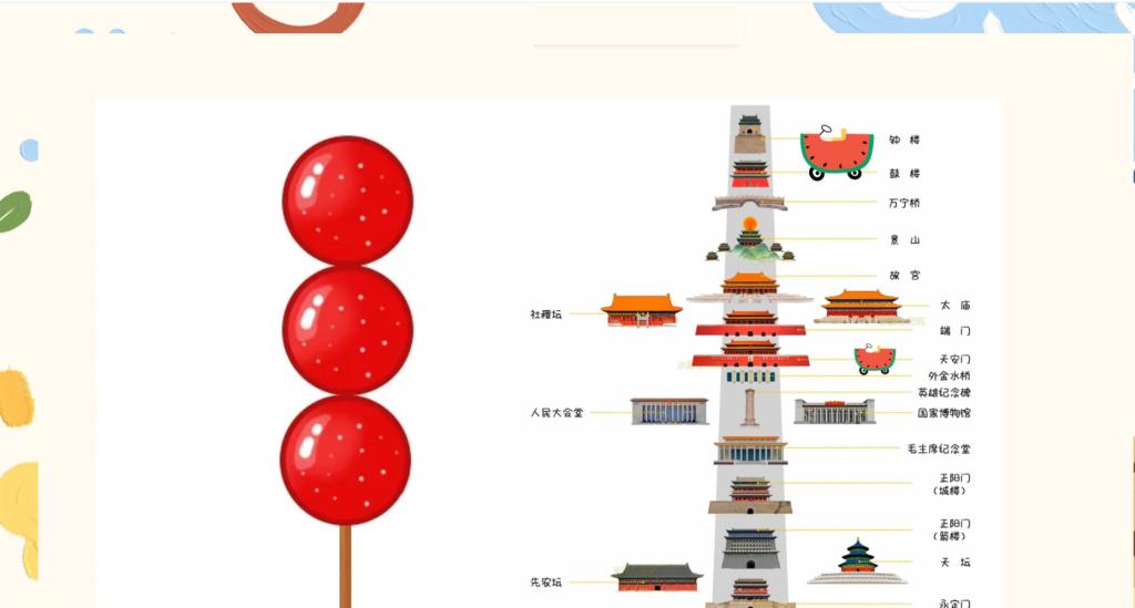 在六年级的收尾课上,课程围绕“我们的保护行动”展开,设置丰富多样的实践任务。课堂中融入北京特色美食元素,如炙子烤肉、钢锅涮羊肉、门钉肉饼、北京烤鸭、炸酱面、北京豆汁、面茶、炸灌肠、豌豆黄、驴打滚等,通过“寻味北京”“看味北京”“尊味北京”等环节,让学生从饮食文化的角度感受北京的独特魅力,同时引导学生思考如何保护中轴线的文化遗产。