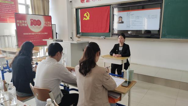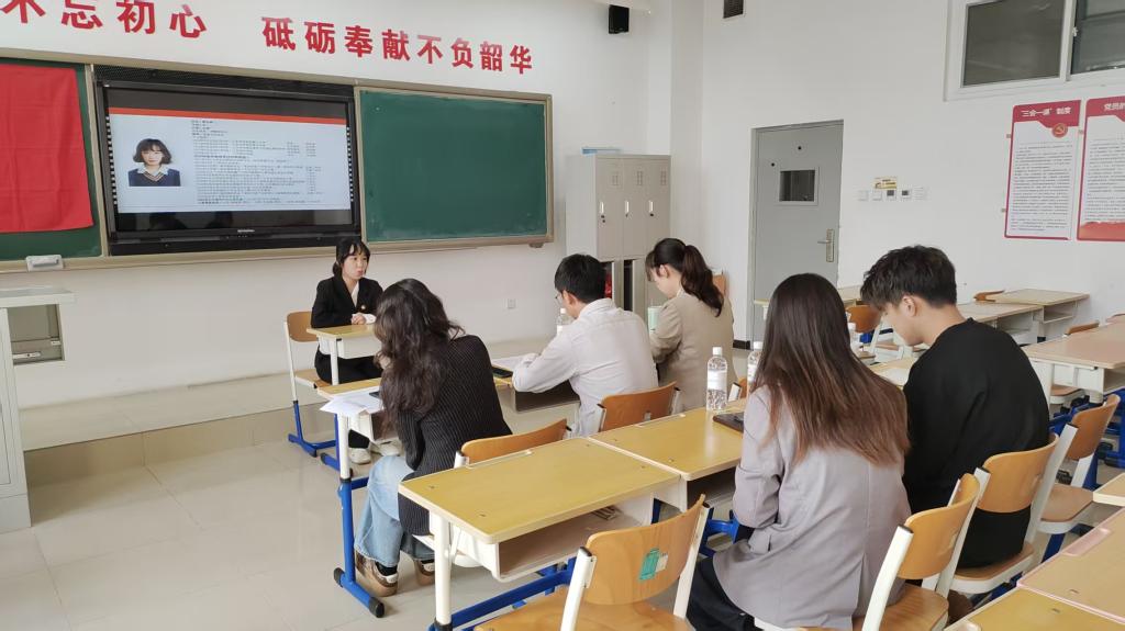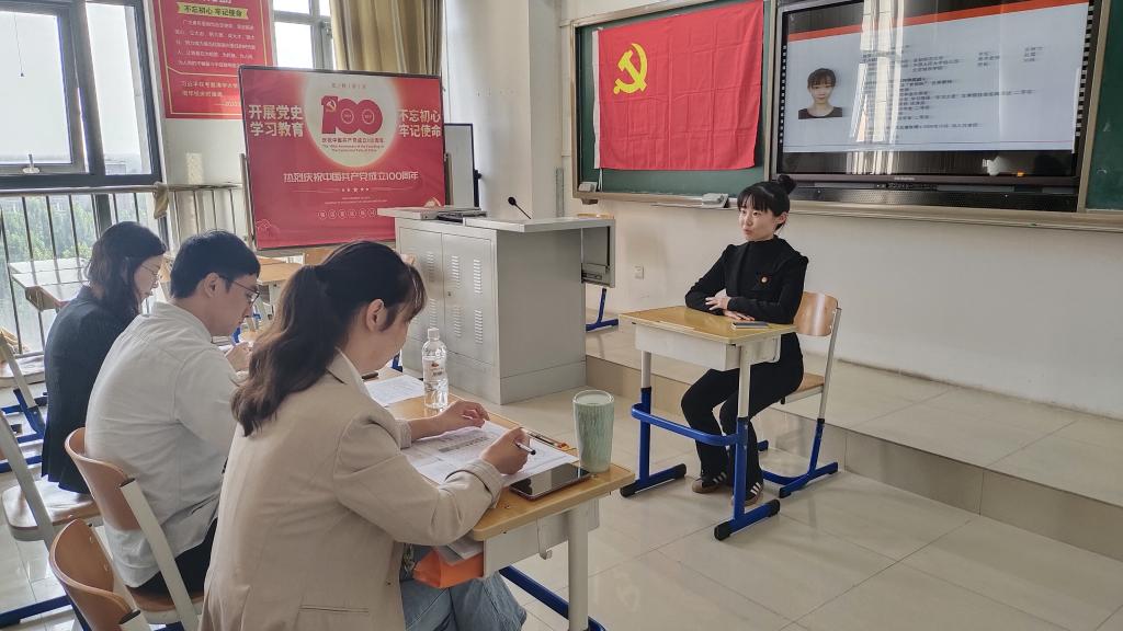 下午14:30面试考核接续进行。评委组包括肖老师、谭老师、张老师以及支部组织委员、宣传委员、党小组组长3名学生党员。作为组织委员肖纪元负责流程衔接,党小组组长马志涛负责拍照,宣传委员谢婉坷负责记录,分工明确、协作高效。李晓滢等10名拟发展对象按顺序入场。自我介绍阶段,学生有序阐述个人基本信息、学习情况、社会实践经历及思想成长历程;问答环节,评委组老师结合学生成长经历深挖入党动机纯粹性与理想信念坚定性,围绕党的理论知识考察掌握与应用能力,结合个人经历了解应对困难、团队协作及服务集体的实际表现,判断学生是否符合党员发展标准,进行客观评分,确保评价准确。
