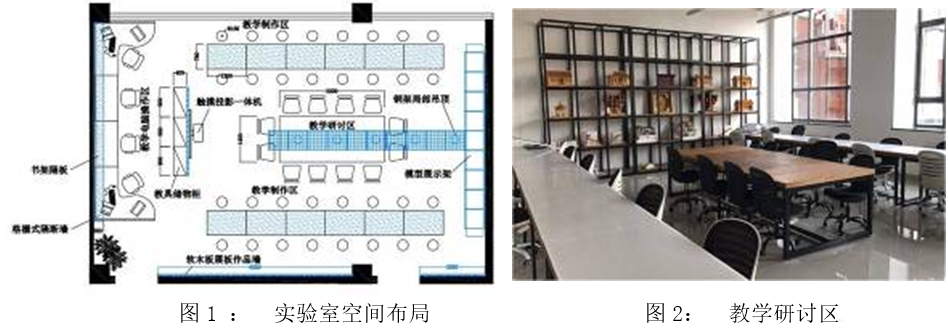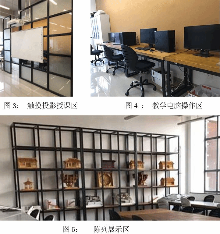 本中心可提供本专业一、二、三年级室内设计、景观设计方向专业主干课程的实践教学工作。平面布置参照企业实际的教学环境,打破以往前后课桌排列的布局方式,依据教学环节设置的功能,分为触摸投影授课区、作品展板墙面展示区、教具模型及优秀模型作品展示区分;依据实验项目设置的功能分为方案(草图、草模)制作区,方案研讨区,项目后期电脑操作区。实现授课与项目实践一体化的布局特色,提高教师教学质量和学生的实际操作能力,缩小课堂教学与社会实际需求的距离,提升专业的实践整体教学质量。
