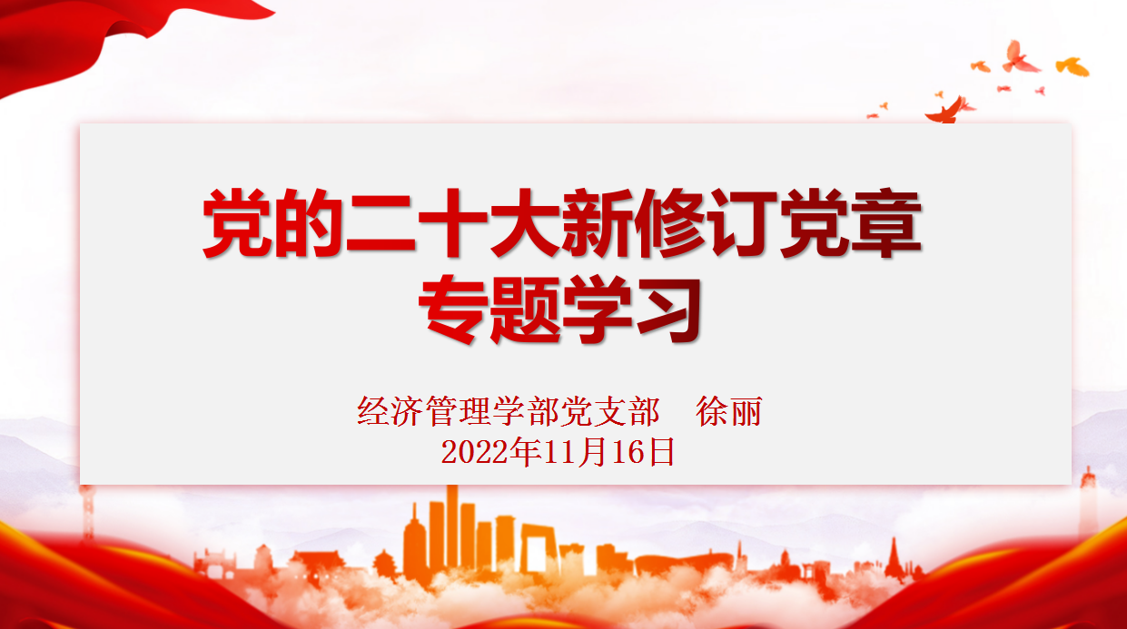 11月16日,经管学部党支部召开党员大会,开展党的二十大新修订党章专题集中学习,本次大会采取线上、线下相结合形式,支部全体党员教师、积极分子参加,党支部书记徐丽主讲。