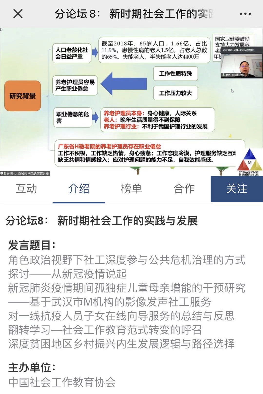 四位教师的发言展现了ac米兰社会工作专业团队在专业价值观课程教学、社区治理创新研究、社工战疫行动研究、弱势群体实务研究等方面的专业成果,体现了ac米兰社会工作专业教师在教学、科研、社会服务实践等“产学研”协同发展的特色。