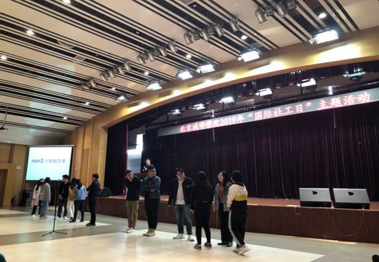 本次主题活动共设有四个环节,第一环节是生动有趣的社工专业知识竞赛。本环节一共有50道题,分别采用个人、小组、团体的方式进行。在小组团体比赛环节,“火炬队”和“佛祖队”的头脑风暴十分精彩,两队不相上下。知识竞赛不仅拉近同学们之间的距离,还让他们对社会工作知识有了更多的了解。第二环节情景剧模拟,主题选取的是社会工作者在日常工作中经常面临的入户访谈问题。同学们自发扮演起来情景剧中要扮演的角色,宋利老师作为督导也参与其中,根据现场情况进行指导,为学生们分享了丰富的入户访谈经验。在第三环节的游戏互动中,活动邀请了具有丰富实务经验的康彦杰同学,在她的专业带领下,同学们体验了几组不同的社工主题游戏,提高学生团队凝聚力的同时,也深刻体会到游戏在社会工作实务中的重要性。最后一个环节是邀请非全日制的同学进行分享,田海健、郭东艳、张霄林三位同学从不同的角度分享了自己从事社会工作者的心里路程,真挚的话语和专业理念使在座的同学受益匪浅,感悟颇多。