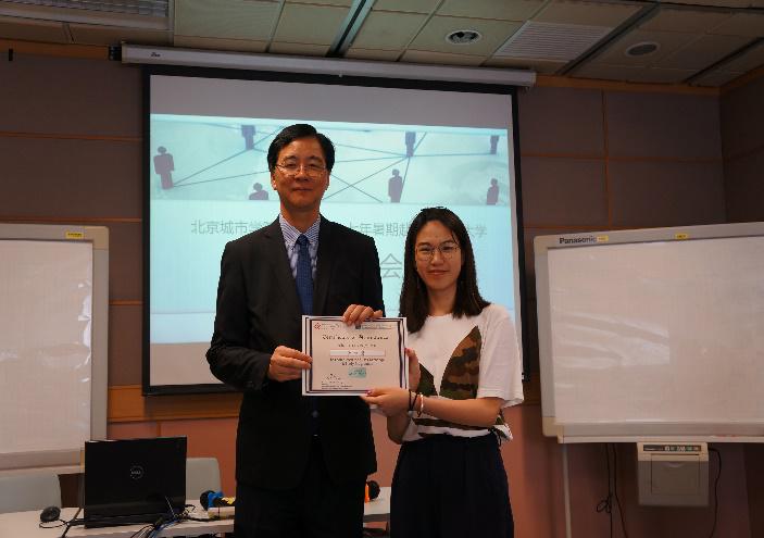 图5为香港理工大学协理副校长石丹理教授为社会工作专业交流团学生颁发培训合格证书