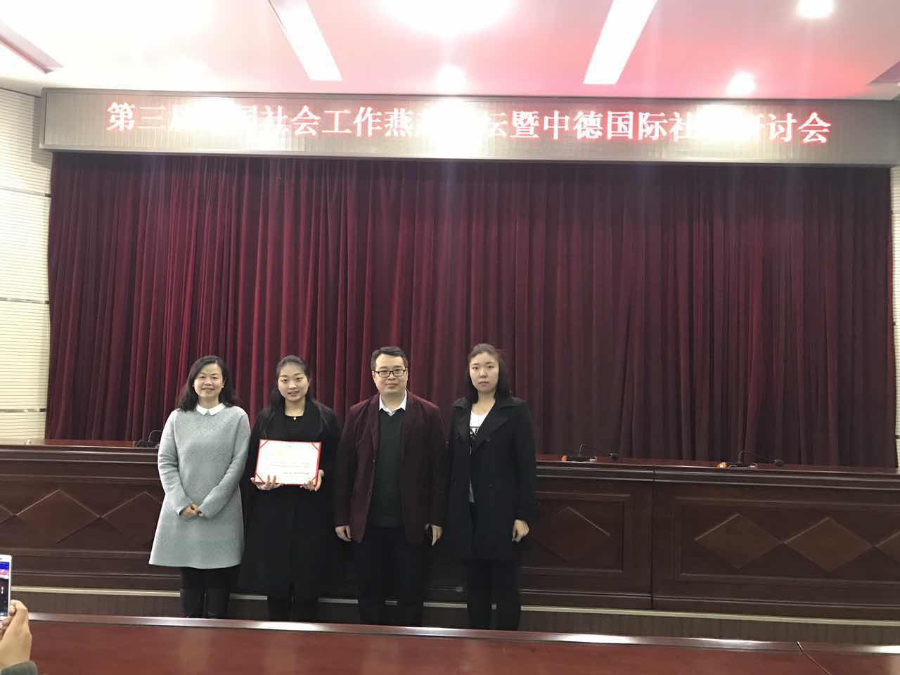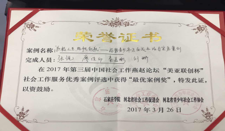 2017年3月26日,由ac米兰公管学部林霞副教授指导、15级社工工作专业硕士研究生张悦任负责人,13社工本秦嘉彬、廖佳印及14社工本刘珊共同参与的《积极人生,扬帆起航—弱势青少年正面成长项目实务案例》荣获第三届中国社会工作燕赵论坛“美亚联创杯”社会工作服务优秀案例奖,在参选的22个案例中,总分名列前茅。林霞副教授和张悦同学应邀向大会做了案例汇报发言。