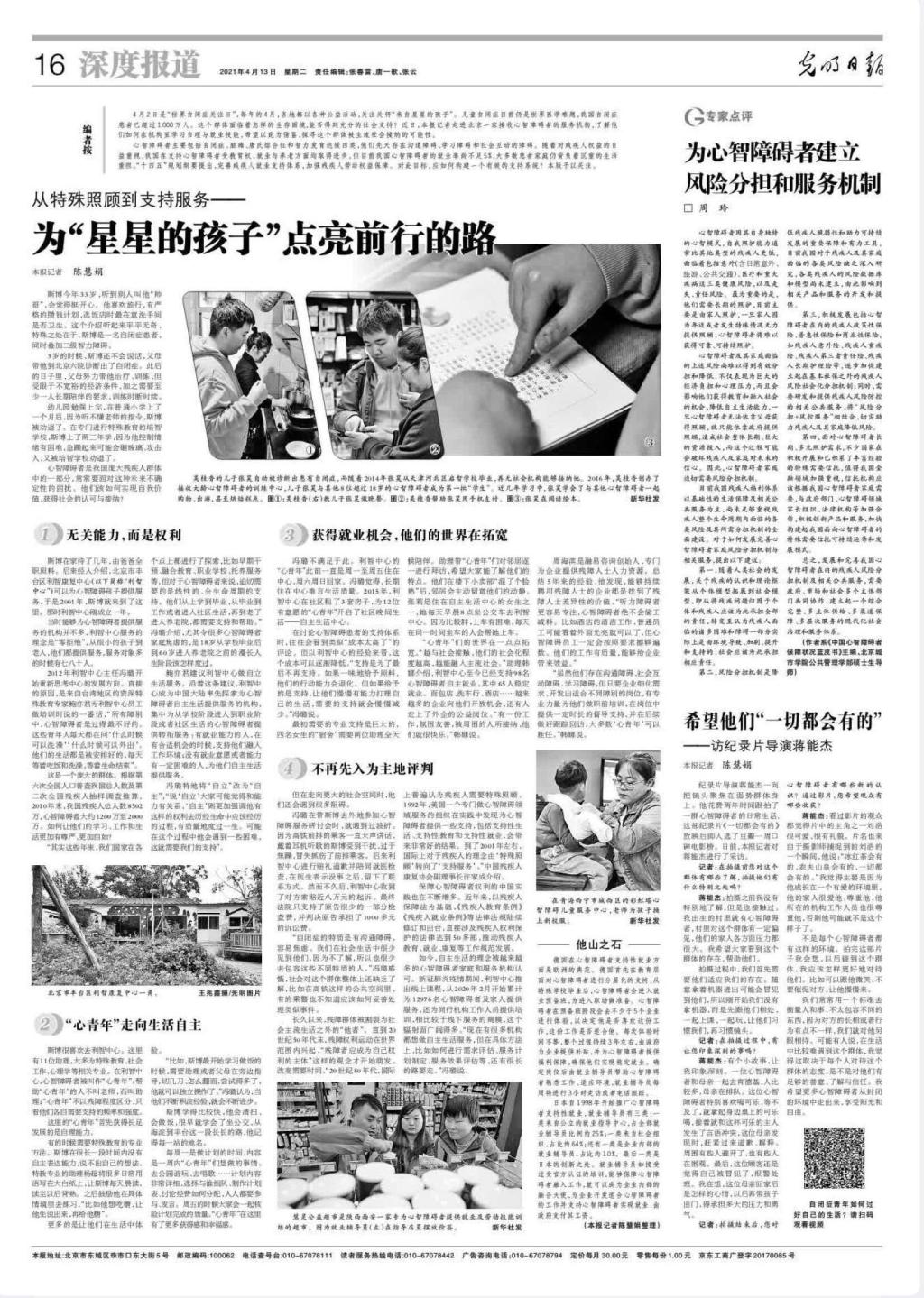 公共管理学部周玲老师2021年4月13日应邀在《光明日报》发表署名文章《为心智障碍者建立风险分担和服务机制》。目前我国残疾人福利体系以基础性的生活保障及相关公共服务为主,尚未足够重视残疾人整个生命周期内面临的各类风险及其所需分担机制的全面建设。发展和完善我国心智障碍者在内的残疾人风险分担机制及相关公共服务,需要政府、市场和社会多个主体部门共同协作,建立起一个综合完整、多主体供给、多渠道保障、多层次服务的现代化社会治理和服务体系。周玲老师对于如何发展完善心智障碍者家庭风险分担机制与相关服务,提出相关建议。