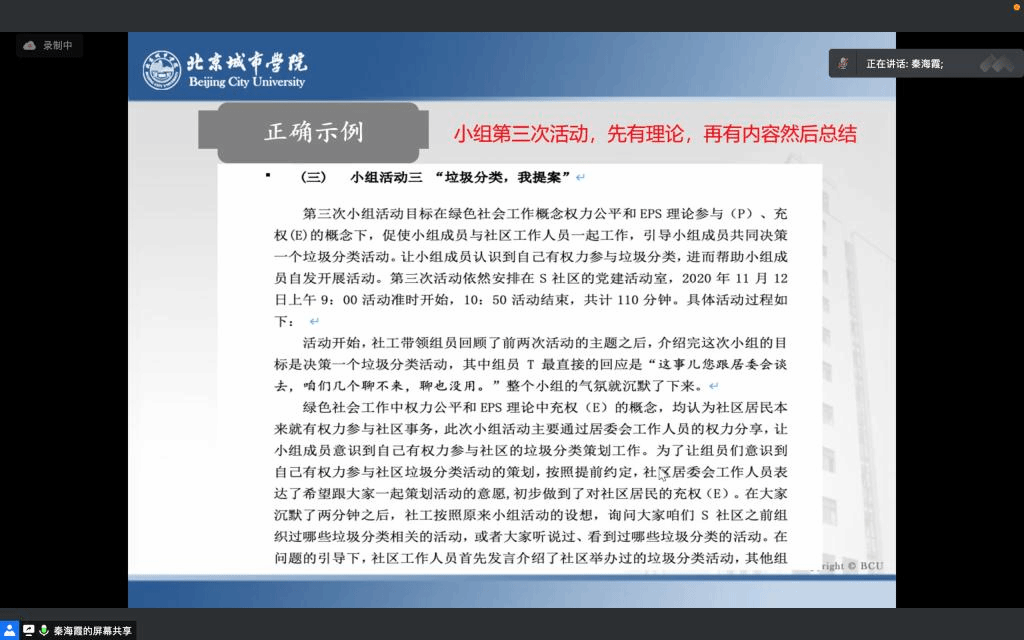 培训会首先针对历年来MSW毕业论文在各答辩环节中出现的问题进行了梳理和总结,并围绕学术委员会前期达成的讨论共识,提出解决思路和建议。秦海霞教授总结MSW论文普遍存在的问题包括六个方面:论文摘要、文献述评、核心概念、研究方法、实务过程和研究结论,通过举例说明、正误对比等方式展示各个部分的问题表现,并提出了相应解决建议。会后,学术导师们围绕具体问题展开讨论,公管学部学术委员会成员针对问题一一解答,初步形成《MSW毕业论文规范性化标准的意见》。