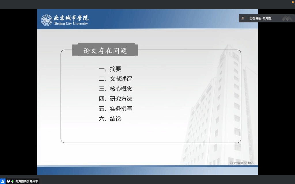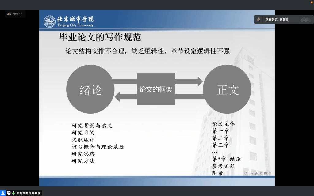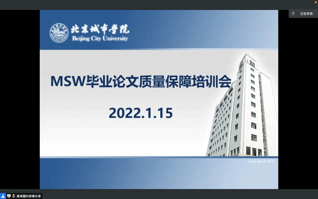 2022年1月15日上午,公共管理学部MSW教育发展中心主持召开MSW毕业论文质量保障培训会,全体学术导师参加会议。会议由MSW教育发展中心主任娄缤元老师主持,公共管理学部学科带头人、学术委员会主任秦海霞教授主讲。