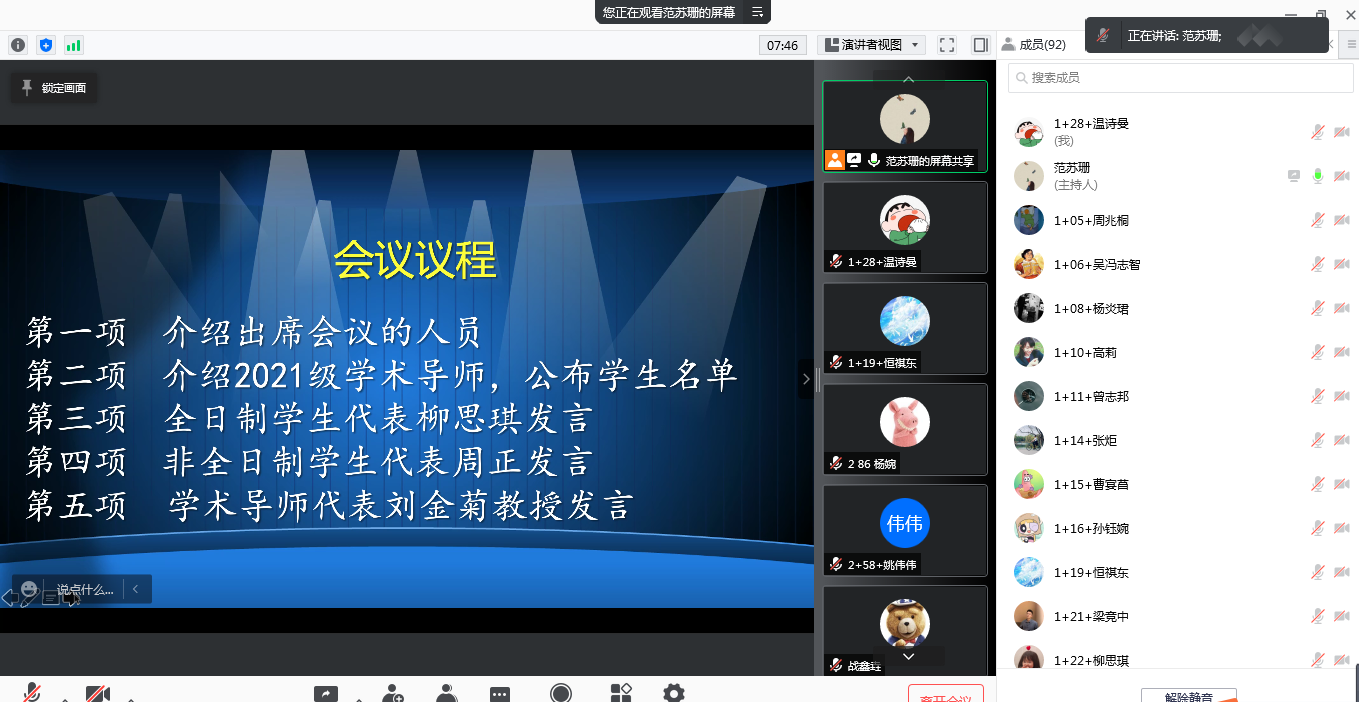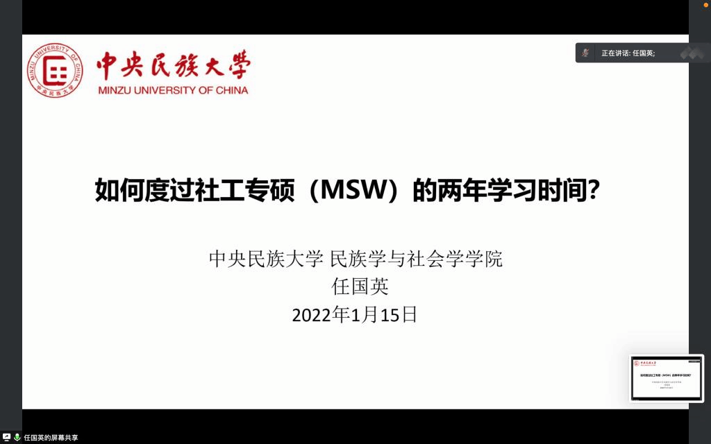 2022年1月15日,公共管理学部MSW教育发展中心举行2021级研究生导师见面会暨“如何做好社会工作专业硕士(MSW)的学位论文”培训讲座。公共管理学部主任张会莹老师、公共管理学部书记胡勇慧老师、公共管理学部副主任娄缤元老师、全体研究生学术导师与2021级研究生,共计101人参加会议。