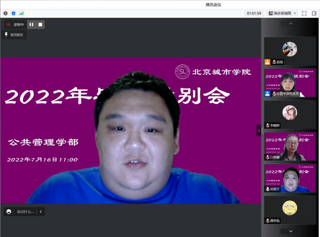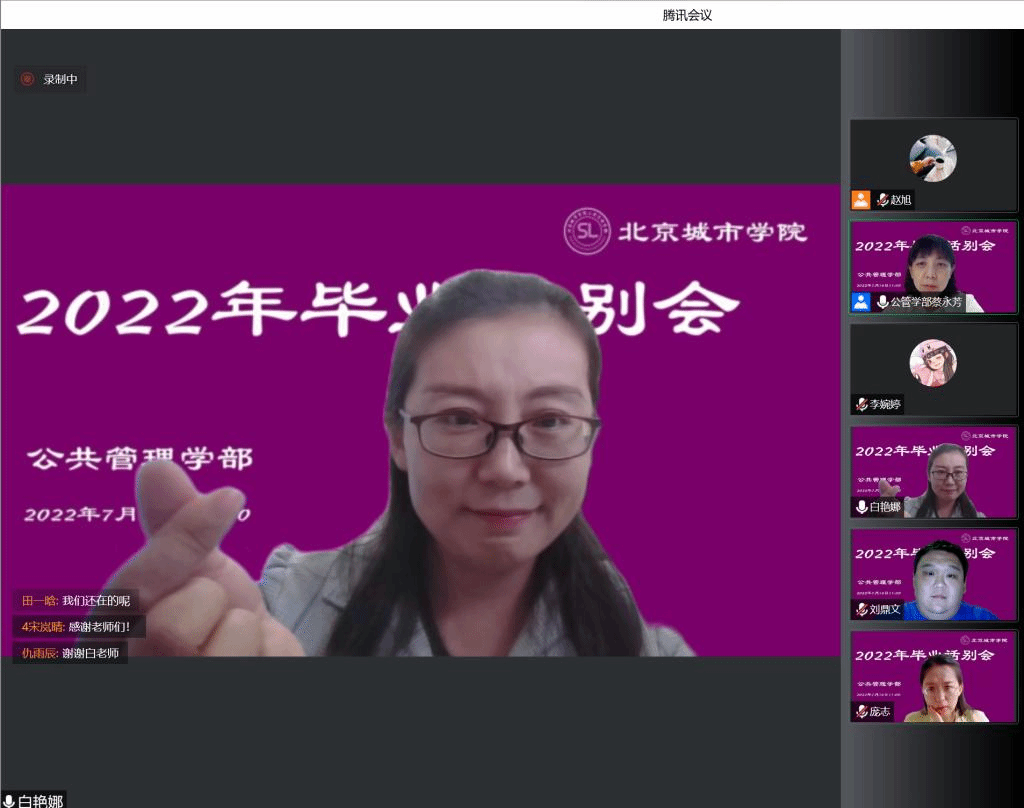 2022年7月16日,公共管理学部线上开展了2022届社工专业毕业生话别会。会议由社会工作专业主任蔡永芳老师主持,学部领导、专业教师、2022届社工专业全体学生参加。党支部书记胡勇慧、班主任白艳娜,专业导师庞志,校友代表刘鼎文分别线上寄语,将祝福定格,将希望定格。