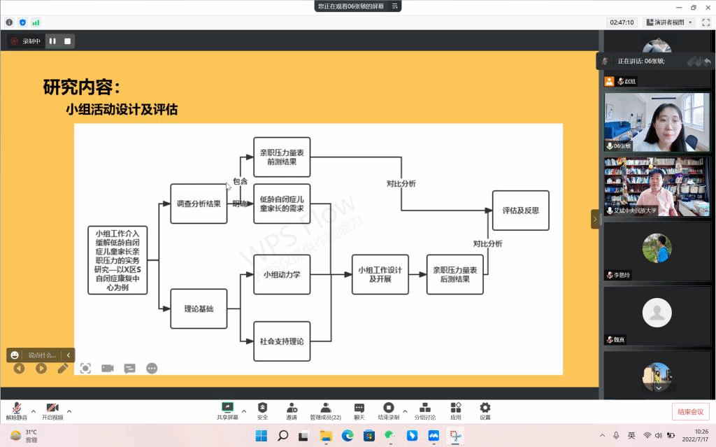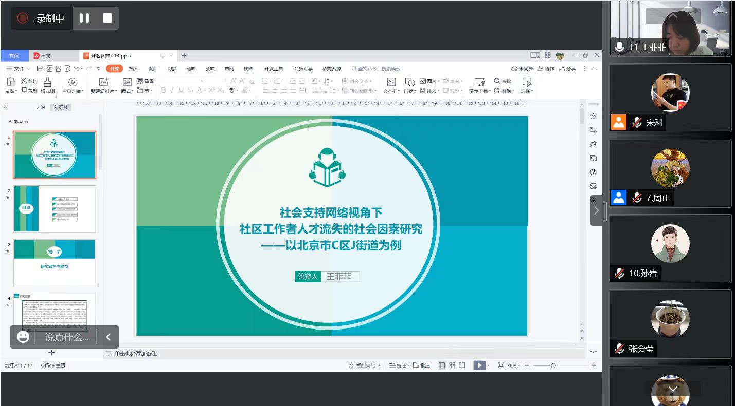 此次研究生开题答辩有13名校外高校、行业内专家和17名校内学术导师共同参与并担任答辩评委。2021级社会工作研究生共计82人参加开题答辩。答辩采取线上腾讯会议的形式进行,共分为6组。