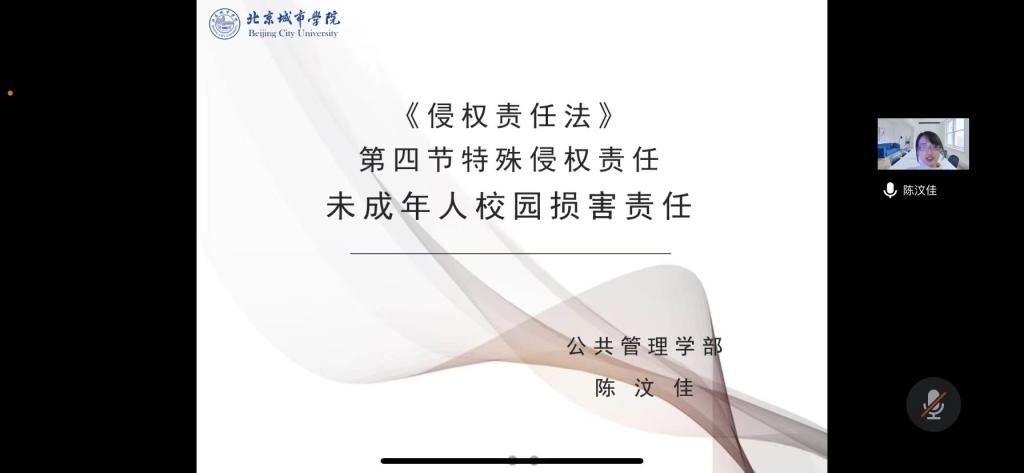 陈汶佳老师从当前的热点话题引入侵权责任法的学习对个体的重要意义,除抓住学生课堂兴趣以外,还对相关概念进行细致地阐释和解读,强化学生对校园损害概念的掌握。