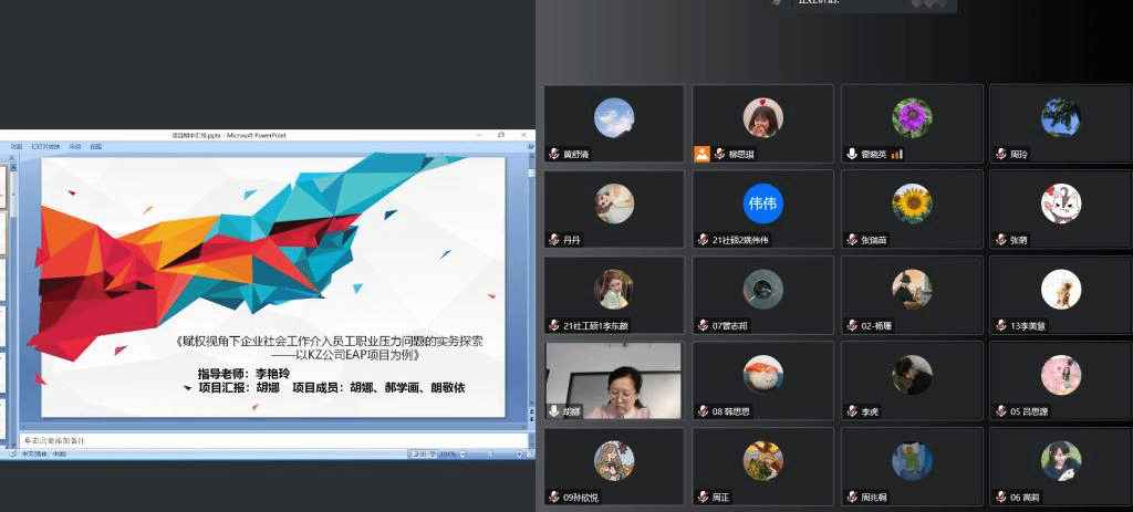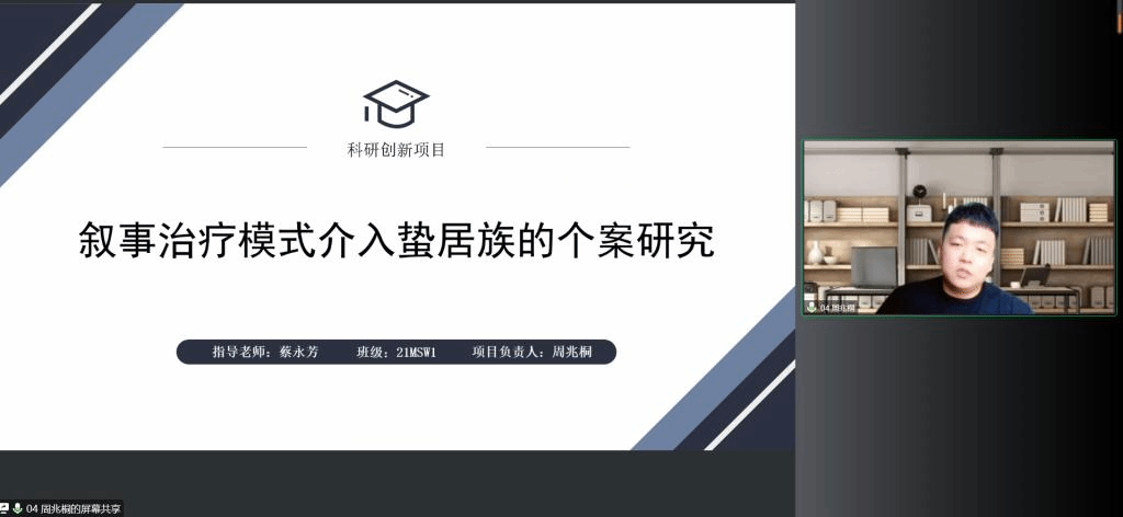 2022年11月17日,公共管理学部MSW教育发展中心召开2022年度研究生科研创新项目中期检查线上答辩会。研究生学术导师蔡永芳、李艳玲、张世霞、霍晓英、周玲、王丹,研究生秘书黄舒清,以及21级科创项目负责人参加本次答辩会。