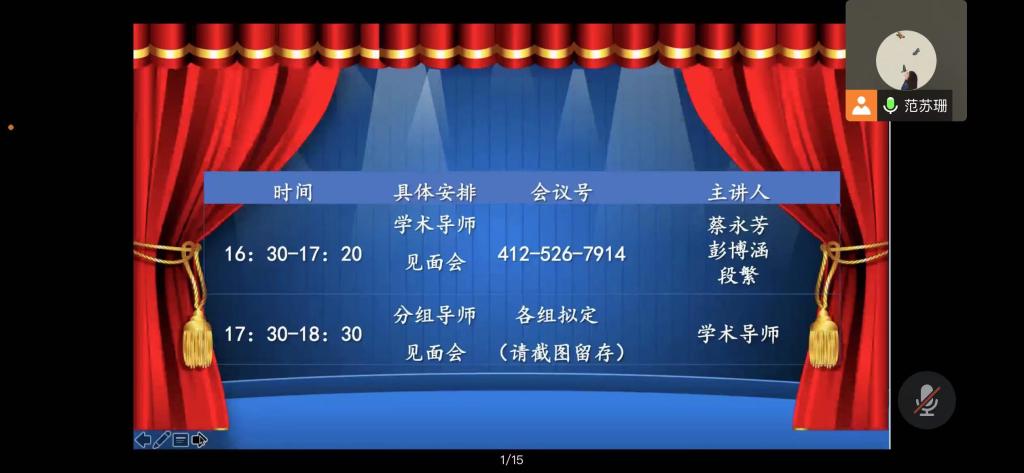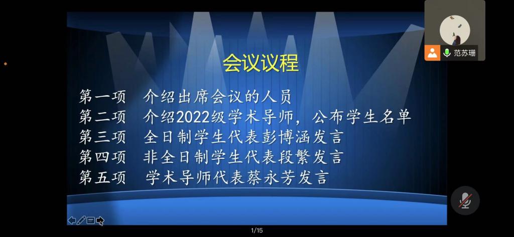 首先是导师见面会环节,共分为五项议程。第一项介绍出席会议的人员。第二项介绍2022级学术导师,公布学生名单。第三项全日制学生代表彭博涵发言,彭博涵同学感谢学校提供的良好的学习环境和教学资源,倡议同学们真抓实干,勇于创新,跟随导师踏实学习,为自己的研究生学术生涯交上一份满意的答卷。