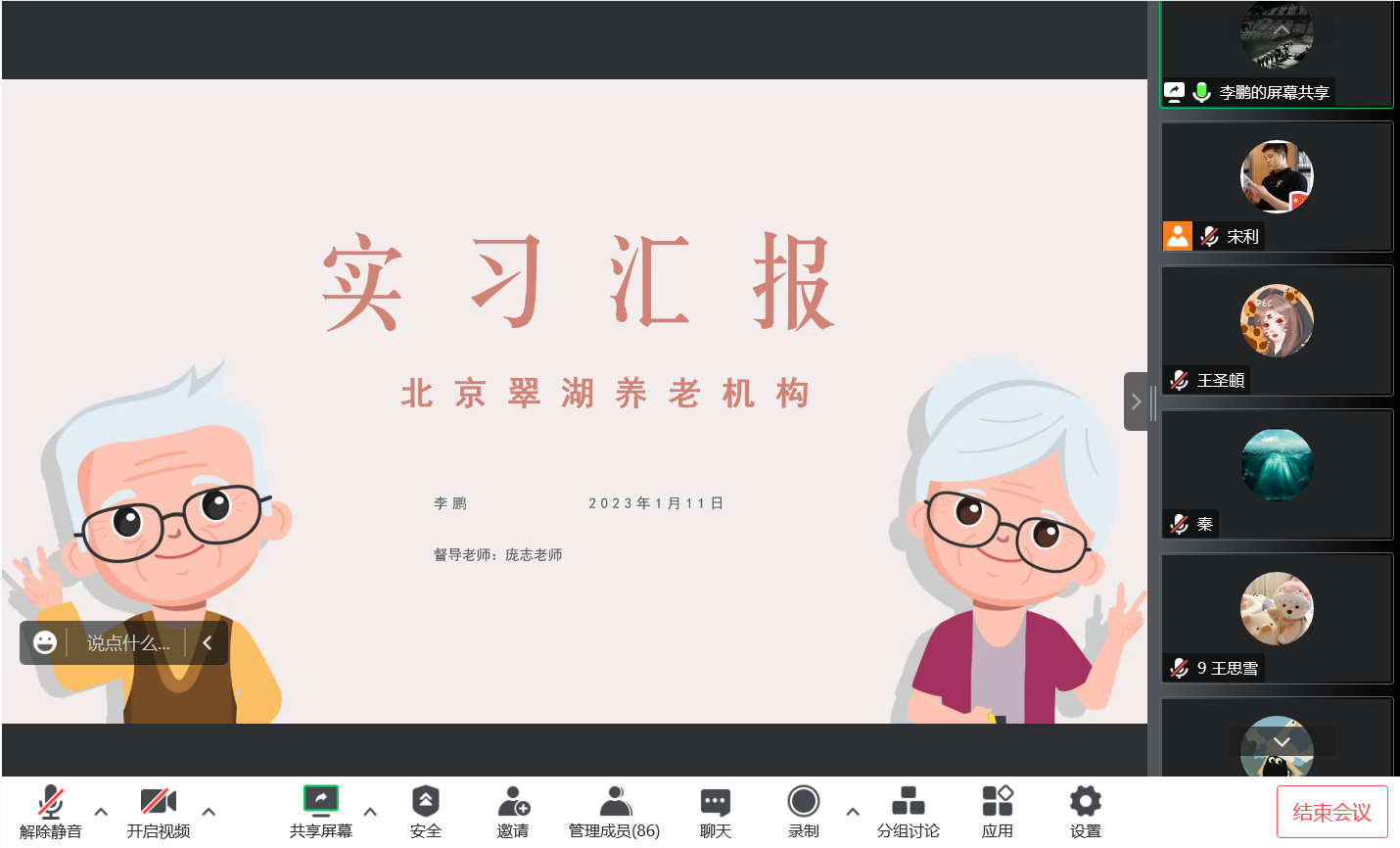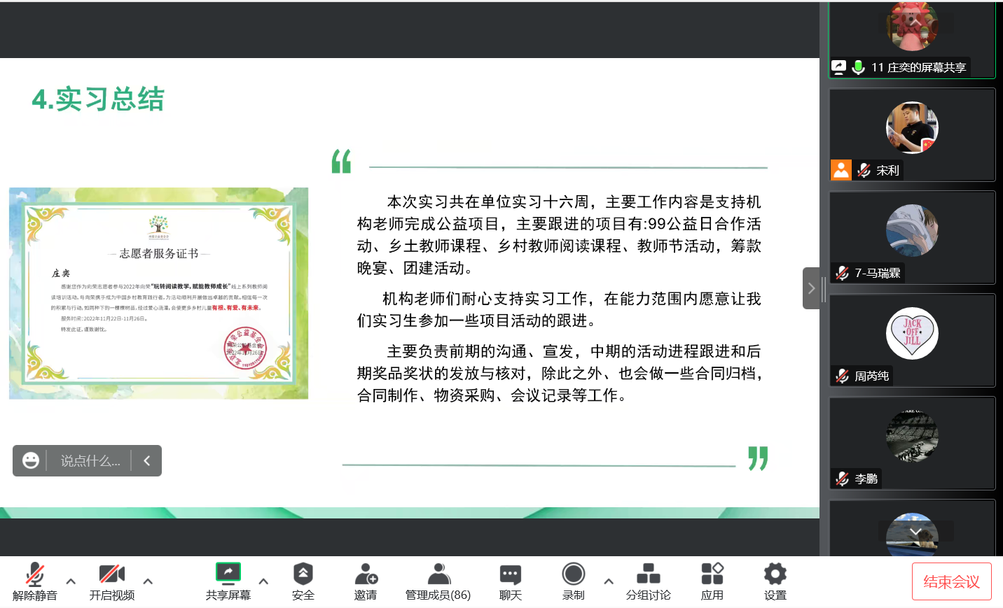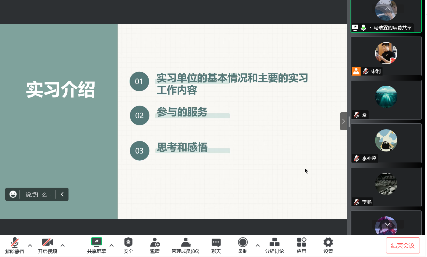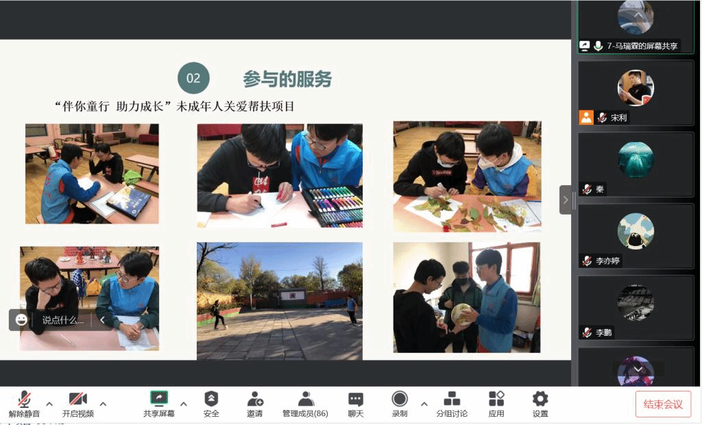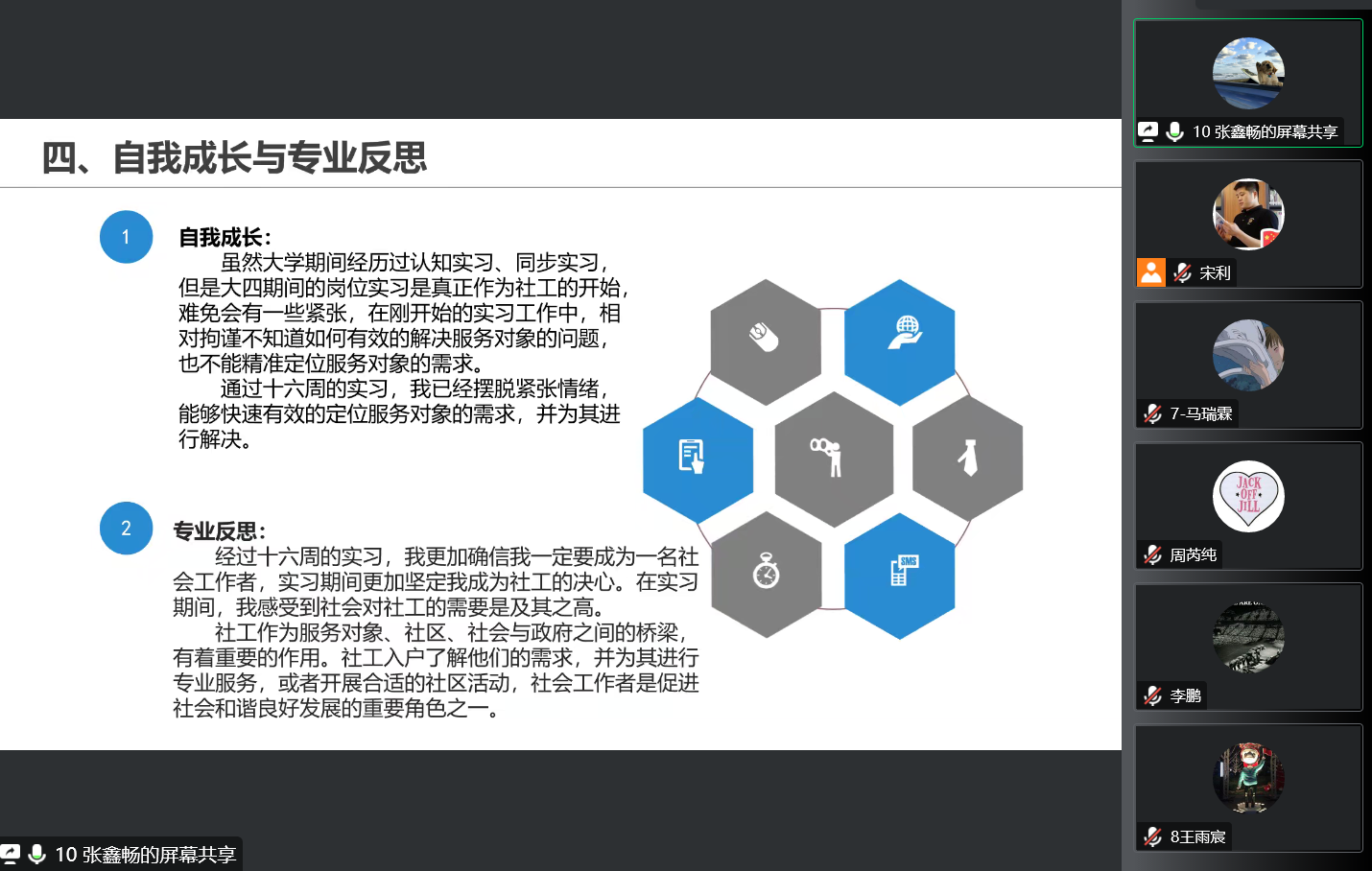本次实习汇报以腾讯会议线上形式进行,并采用督导老师推荐制,即每位实习督导老师推荐一名学生代表进行实习汇报。